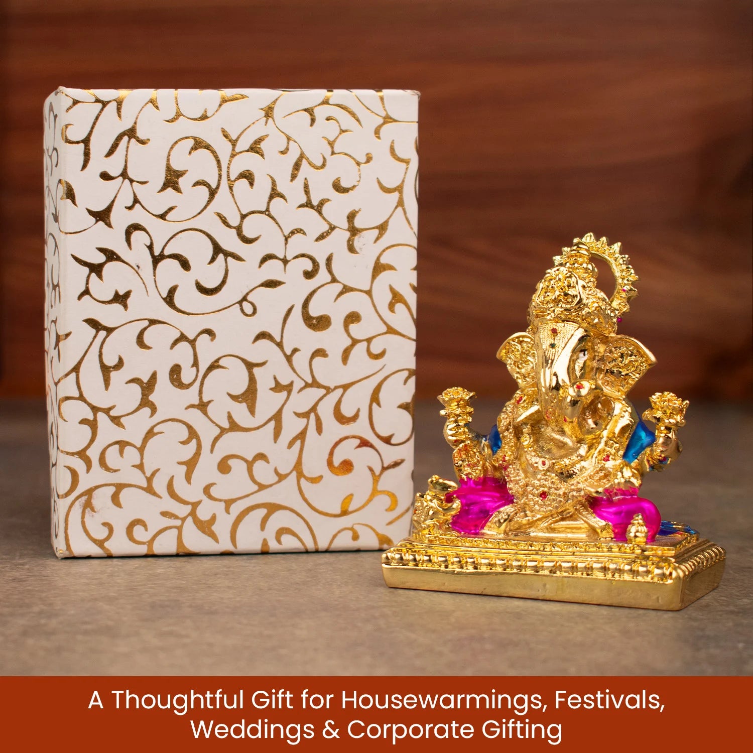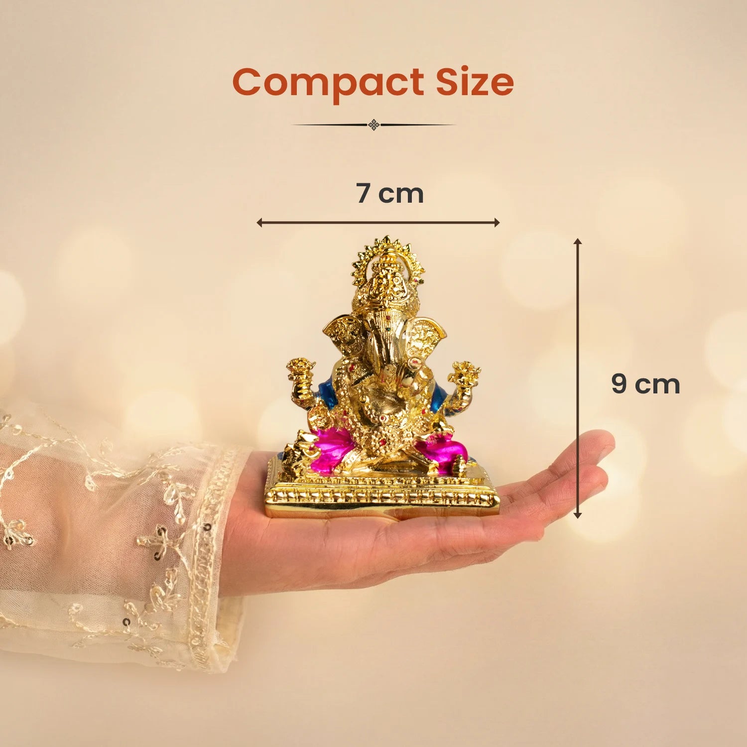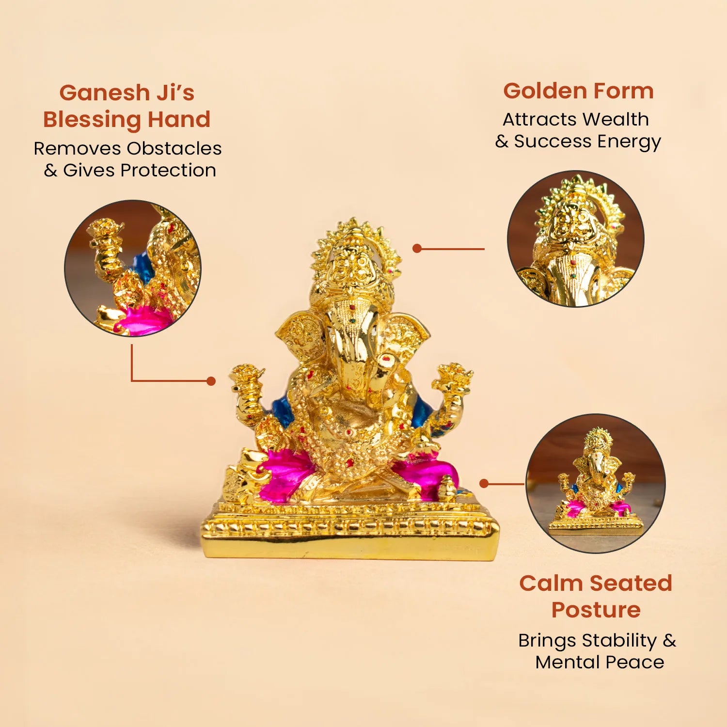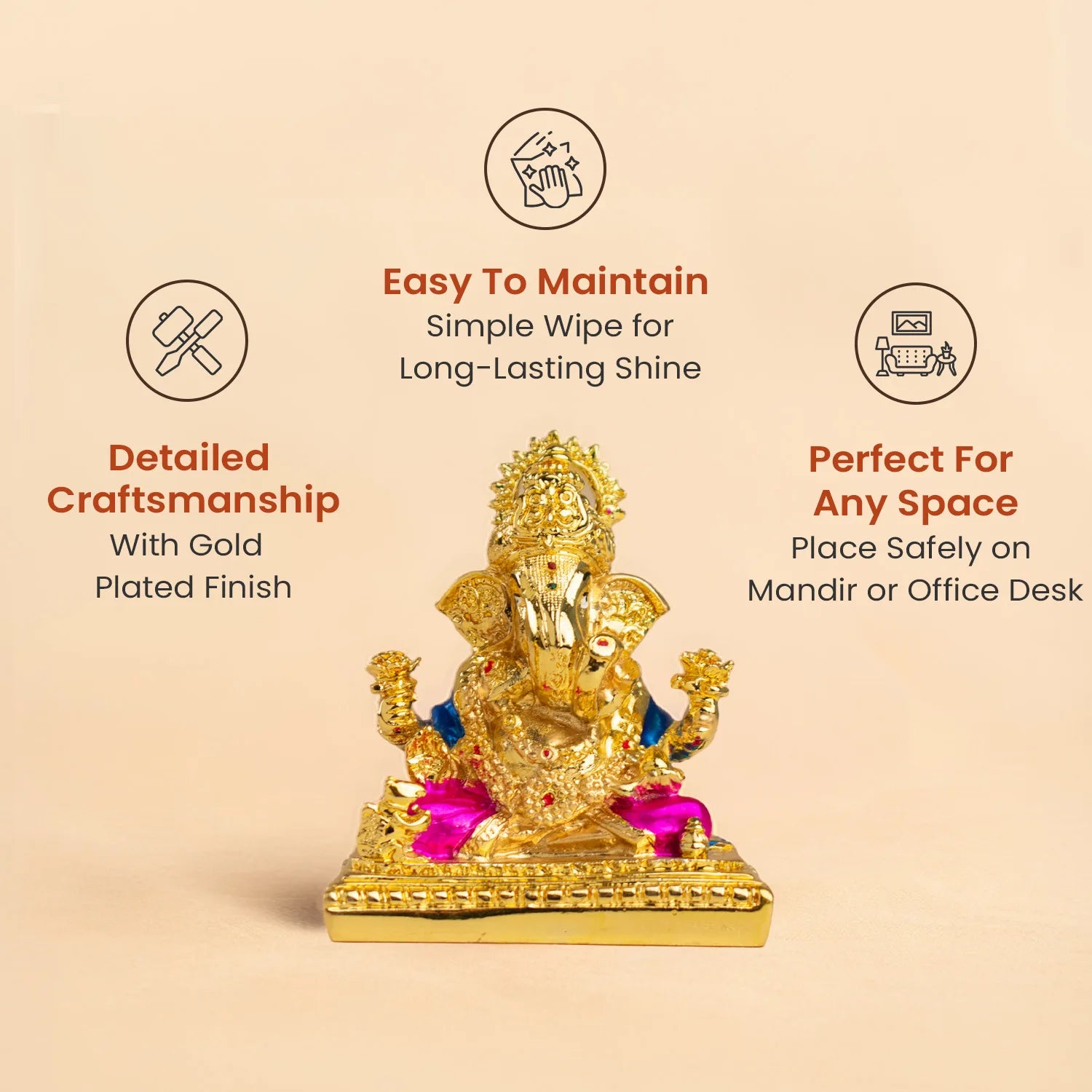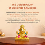 This golden-plated Lord Ganesha symbolises abundance, clarity, smooth progress, and new beginnings. His raised hand shows blessings and protection, while his calm posture reflects peace, patience, and understanding.
