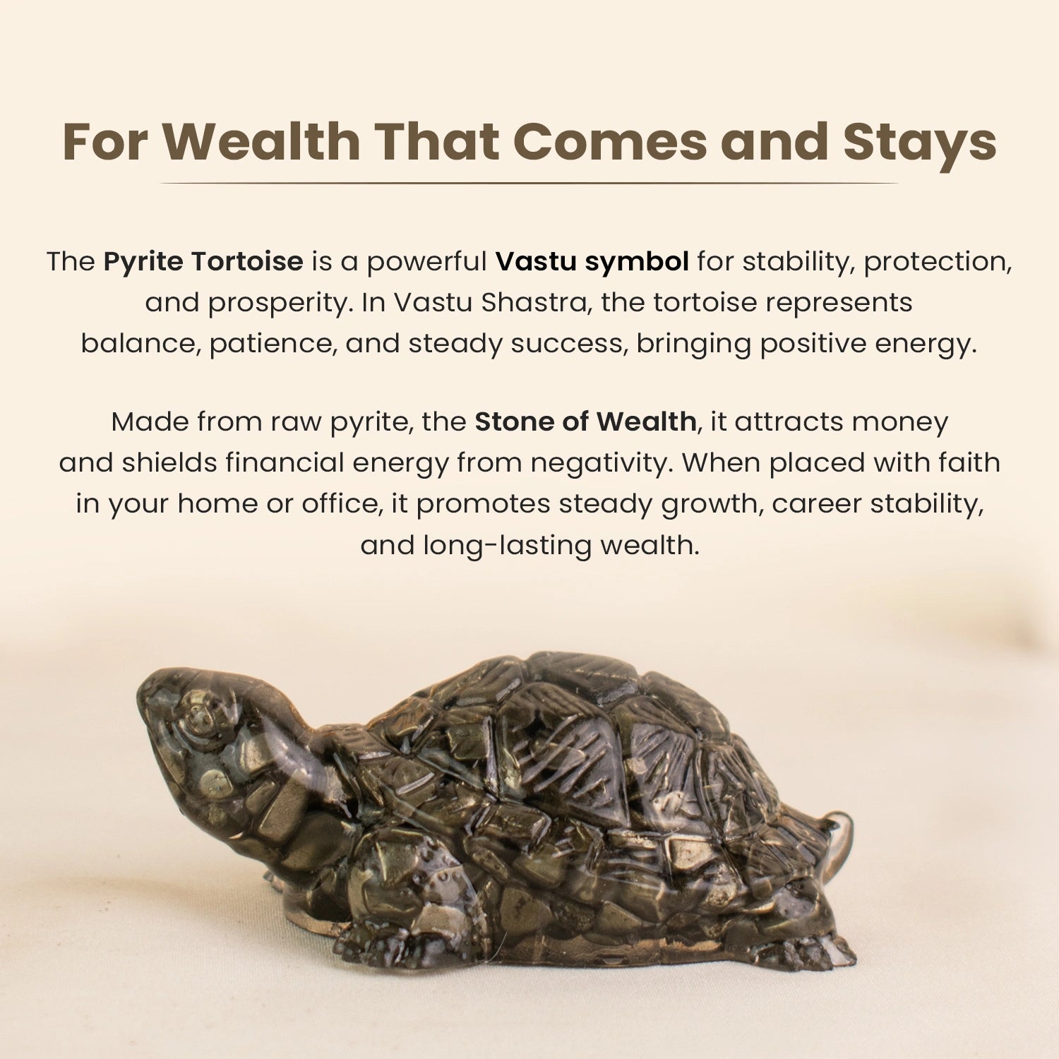 Prepaid orders are delivered on priority.The Pyrite Tortoise - Collector’s Edition brings together the wealth-attracting energy of Pyrite, often called the Stone of Wealth, with the strong and protective nature of the Tortoise. Together, they support steady financial growth, build confidence, and help create stability while protecting against negativity and money-related setbacks.