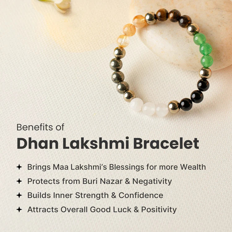 • Dhan Lakshmi Bracelet: Made with crystals like Pyrite, Green Aventurine, Quartz, Citrine, Hematite, Black Obsidian, and Tiger Eye. These crystals are believed to support money flow, confidence, and protection from negative energy.