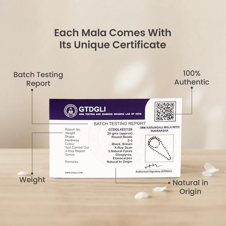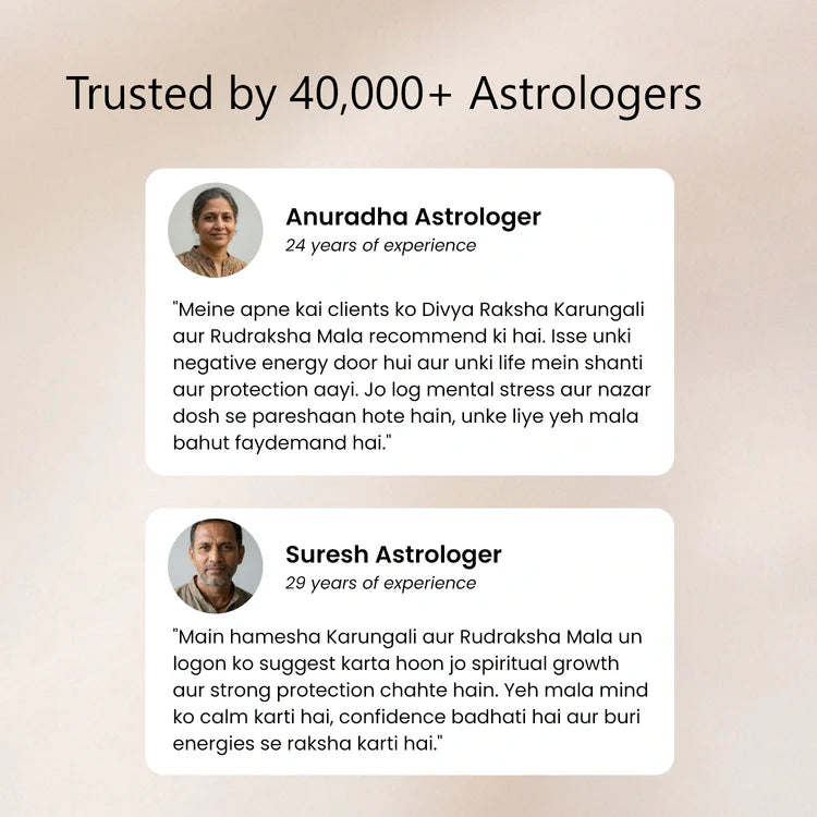 • Divya Raksha Rudraksha & Karungali Mala: Made with 5 Mukhi Rudraksha and Karungali beads to support a calm mind and protect from negative energy.