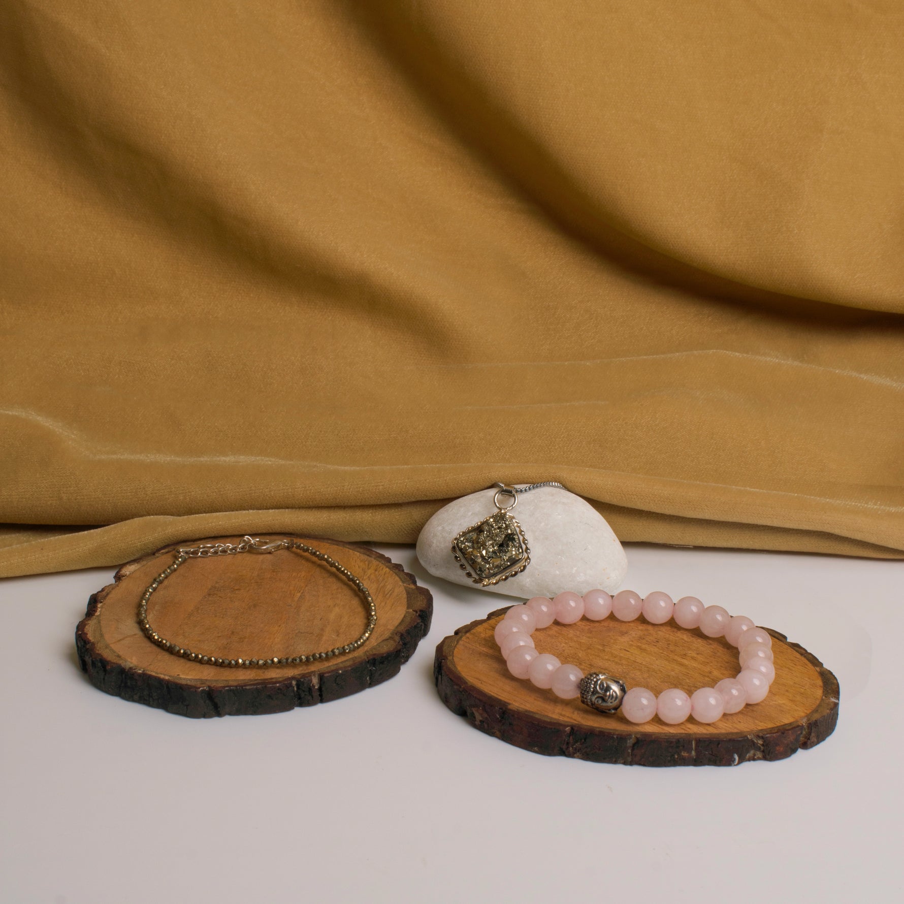 Prepaid orders are delivered on priority.Step into your royal energy with the Maharani Combo. It includes a Raw Pyrite Pendant, a Matching Anklet, and a Rose Quartz Bracelet with a calming Buddha charm. This trio works together to help you manifest money, feel more love for yourself, and stay emotionally centered. Furthermore, it blends healing energy with everyday elegance.