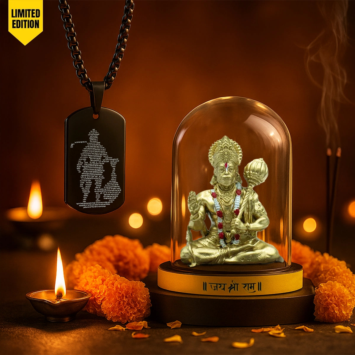 Murti & KavachLimited Edition Shakti Bal Hanuman Combo, blessed at the sacred 300-year-old Prachin Narsingh Hanuman Temple, Chandni Chowk (Delhi). This combo includes a powerful Siddh Hanuman Chalisa Kavach and a Shakti Bal Hanuman Murti in a Borosilicate Glass Dome. Designed for divine protection, strength, health, and spiritual upliftment. Only 501 sets will ever be made.