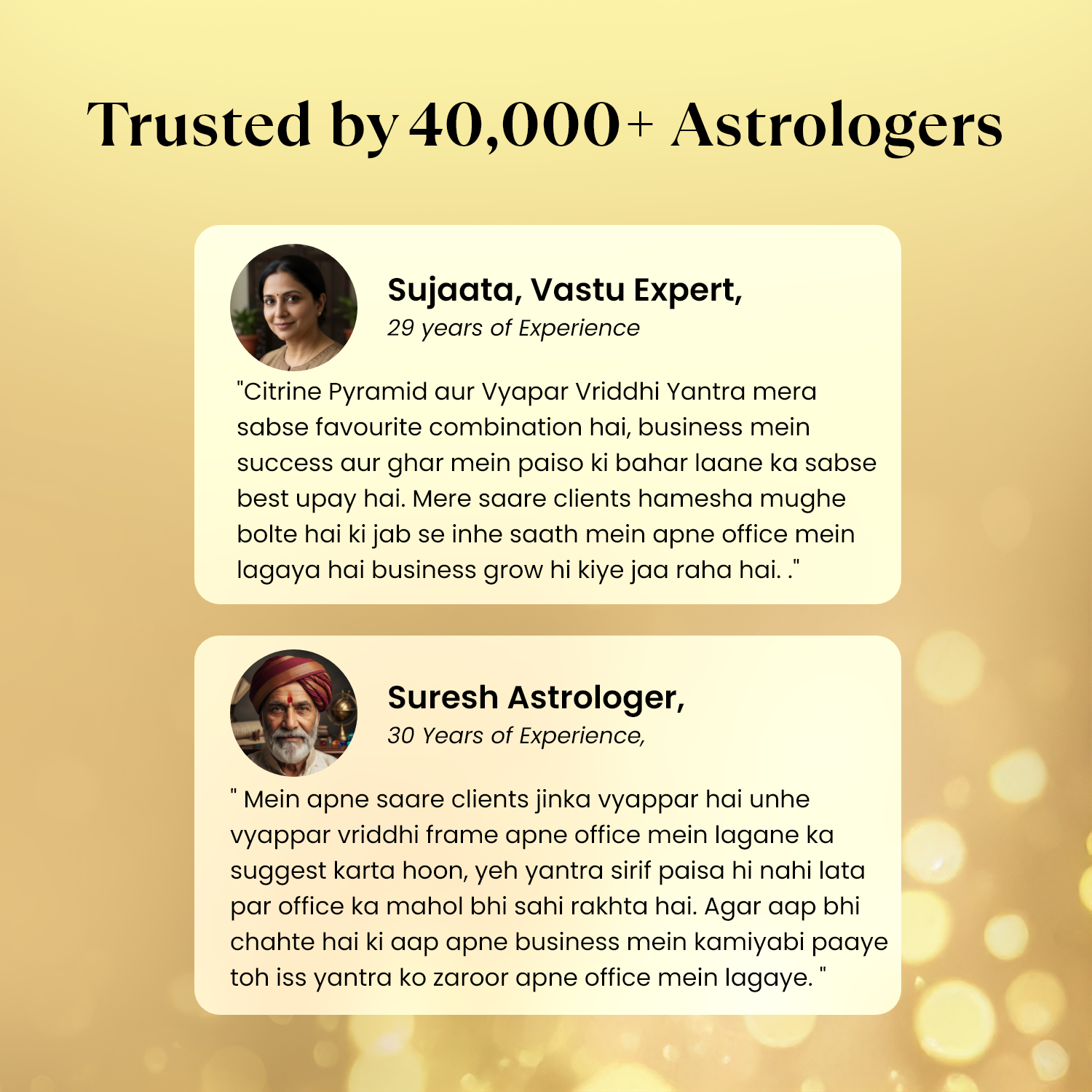 Prepaid orders are delivered on priority.The Vyapar Vriddhi Combo combines the powerful energy of the Vyapar Vridhi Frame with the bright positivity of a Citrine Pyramid. This combo is designed to attract thriving business growth, financial prosperity, and success. The Vyapar Vridhi Frame symbolizes business expansion and removes hurdles, while Citrine, known as the “merchant's stone,” enhances wealth, clarity, and motivation. Together, they create a strong environment for progress and abundance in any workspace or home office.