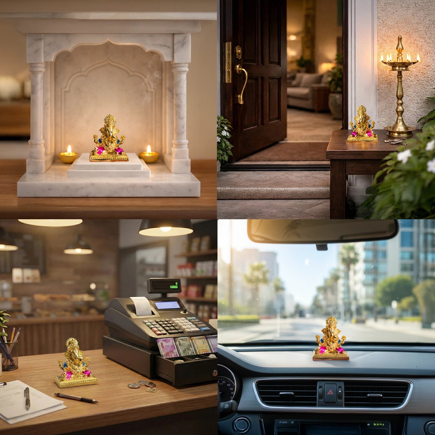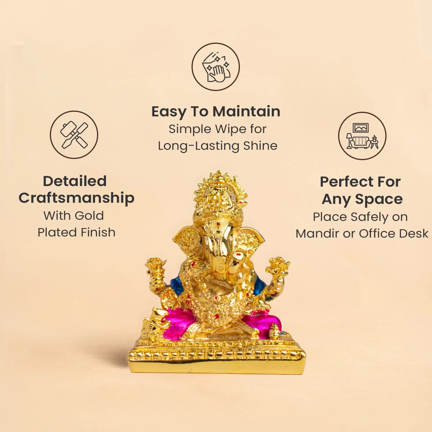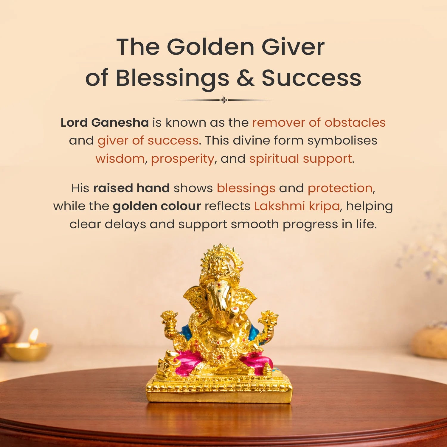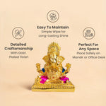 This golden-plated Lord Ganesha symbolises abundance, clarity, smooth progress, and new beginnings. His raised hand shows blessings and protection, while his calm posture reflects peace, patience, and understanding.