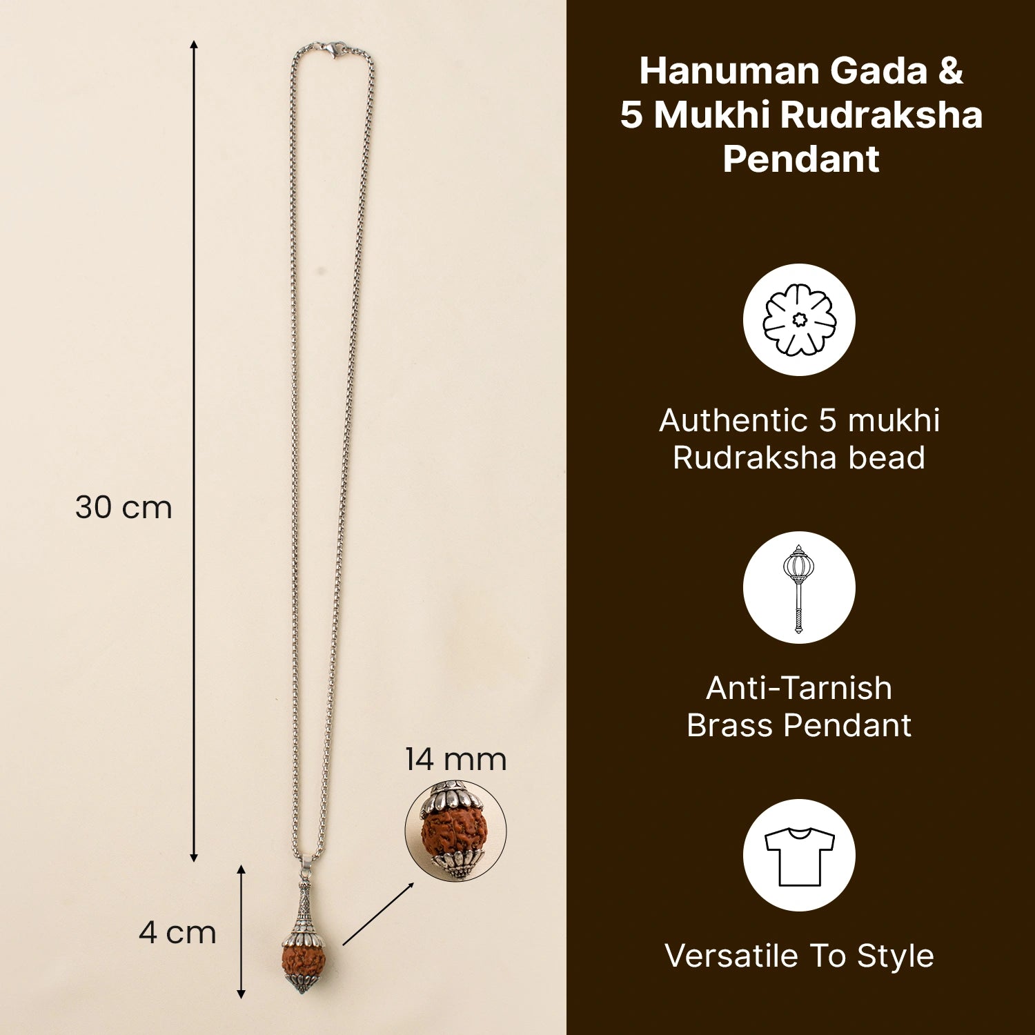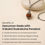 Prepaid orders are delivered on priority.The Rudraksha Hanuman Gada Pendant combines Lord Hanuman’s Gada (symbol of strength) with an authentic 5 Mukhi Rudraksha of Lord Shiva, creating a powerful double shield of courage and calmness.