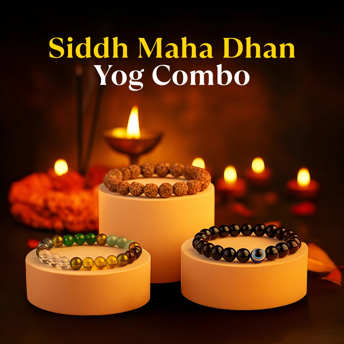 Prepaid orders are delivered on priority.Experience powerful and divine blessings with this Limited Edition Siddh Maha Dhan Yog Combo. Representing Lord Shiva, it's powerfully Siddh with Rudraabhishek at Kashi's 1000 years old Kedareshwar Mahadev Mandir. These bracelets are more powerful and effective.