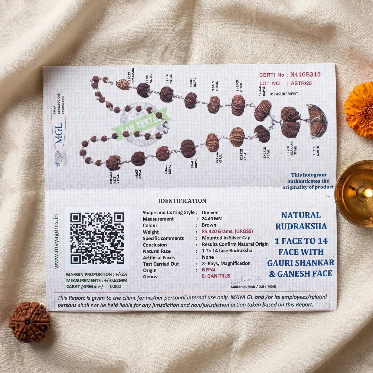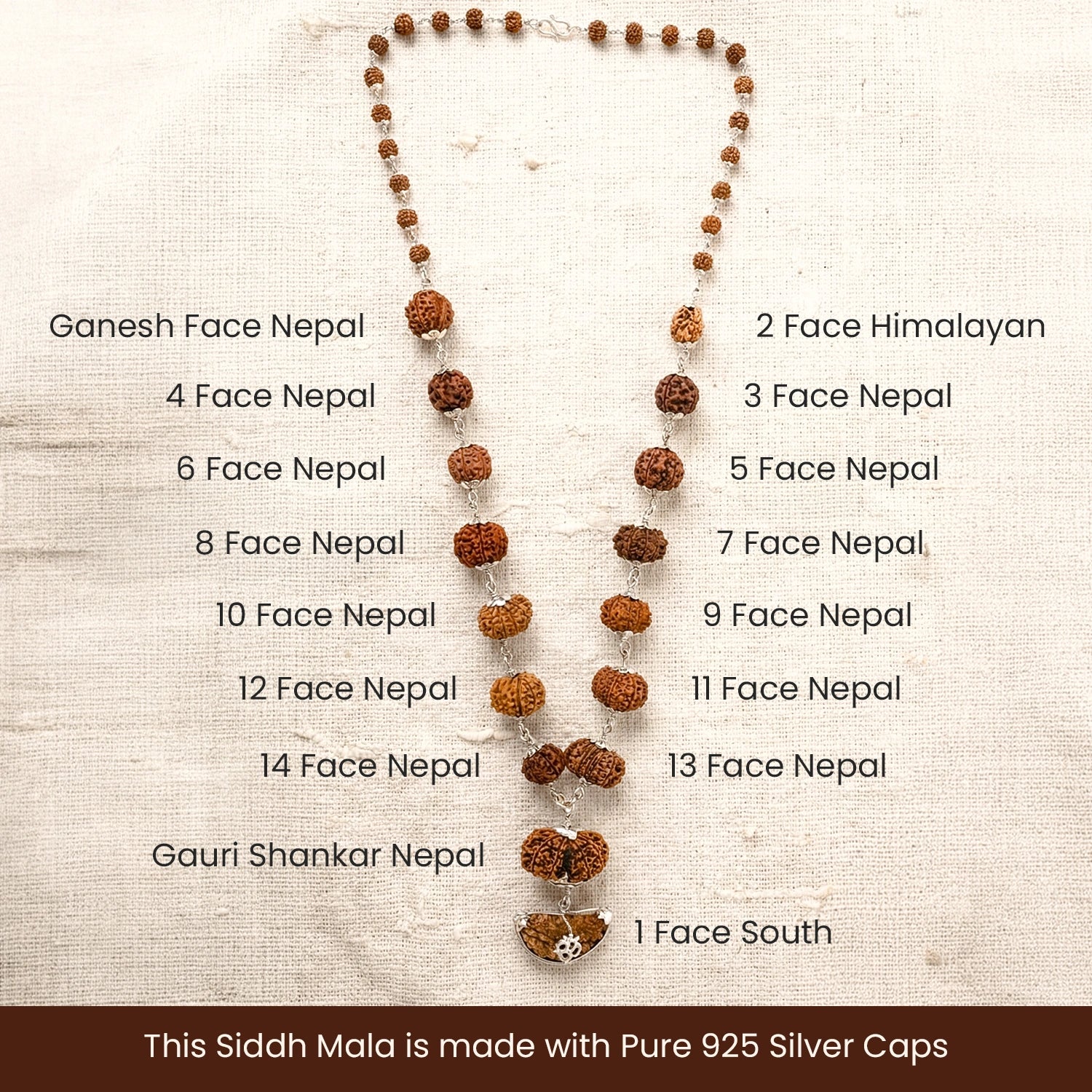 Prepaid orders are delivered on priority.This 1 to 14 Siddh Mukhi Rudraksha Mala is a powerful and sacred mala crafted from authentic Nepali Rudraksha beads, including rare high-value collector beads like 1 Mukhi Kaju, Ganesh Rudraksha, and Gauri Shankar Rudraksha. Each bead carries strong spiritual vibrations and is mounted in 925 silver caps for purity and long-lasting durability.