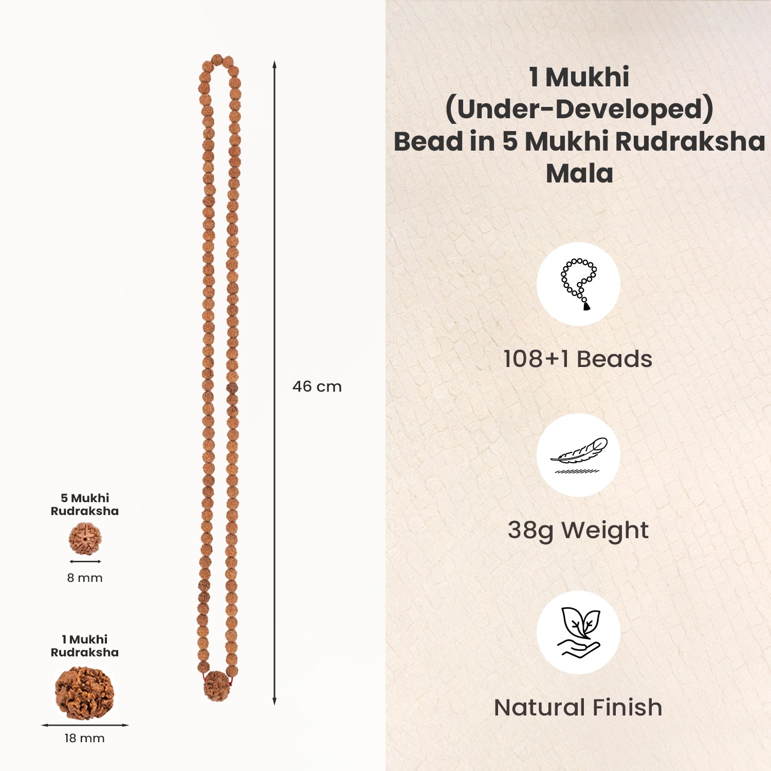 Prepaid orders are delivered on priority.This sacred Rudraksha mala carries the pure energy of Lord Shiva. It is made with 108 powerful Nepali-origin 5 Mukhi Rudraksha beads that bring calmness, protection, and balance, along with Nepali-origin Under-developed 1 Mukhi Rudraksha, known for its deep spiritual awakening and strong connection with Shiv Tatva.