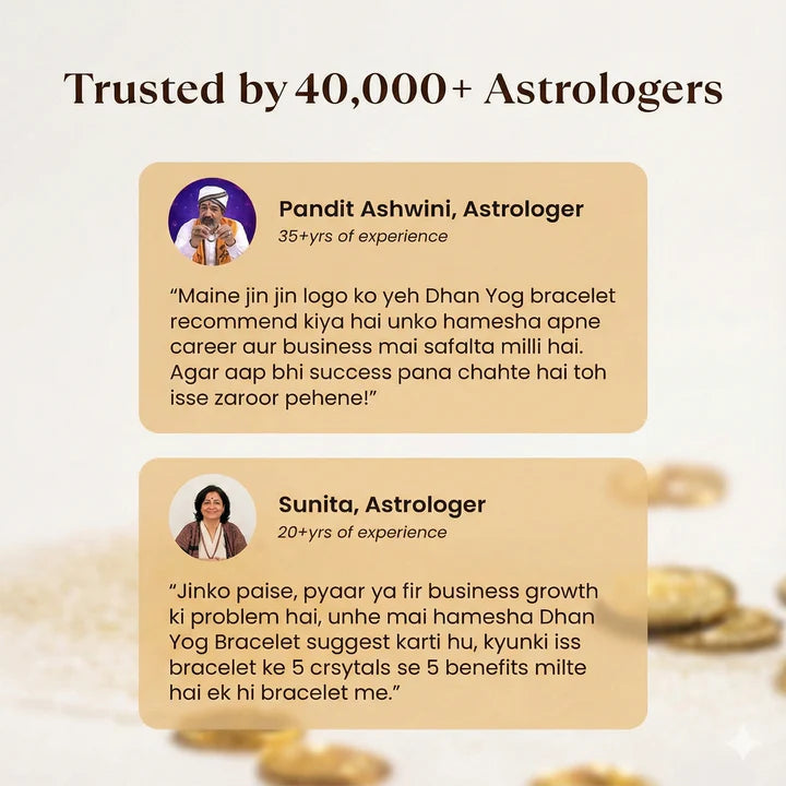 - Dhan Yog Bracelet: Crafted from Citrine, Tiger Eye, Hematite, Quartz, and Pyrite, it enhances concentration, self-assurance, and wise choices for everyday professional tasks. It also amplifies prosperity vibes, keeping you connected to progress, balance, and money-making objectives.
