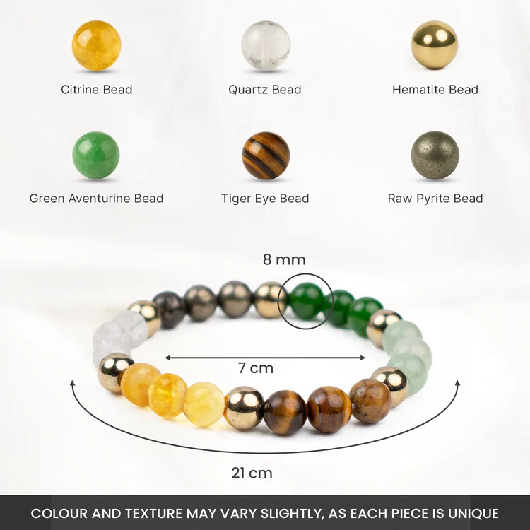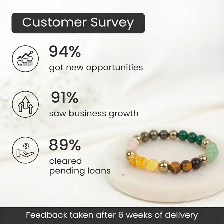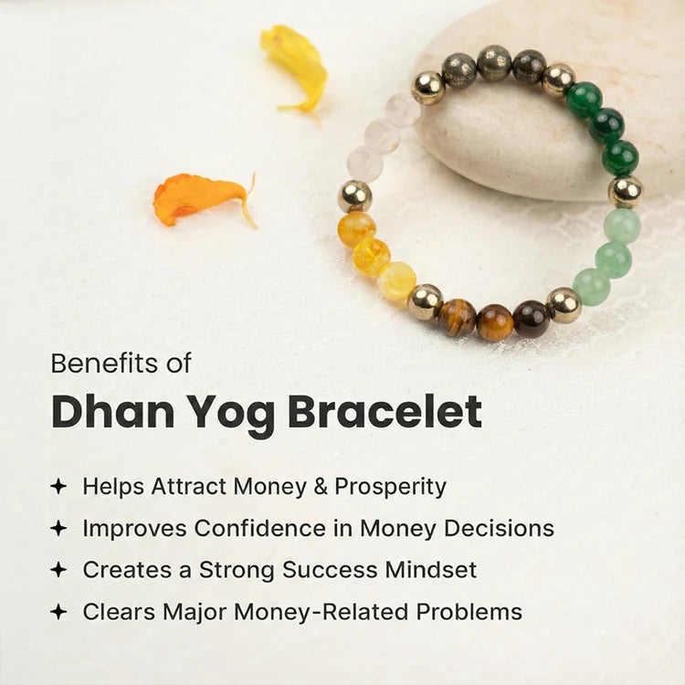 - Dhan Yog Bracelet: Crafted with Citrine, Green Aventurine, Tiger Eye, Quartz, Hematite, and Pyrite, it helps build confidence, focus, and smart decision-making while attracting steady income.