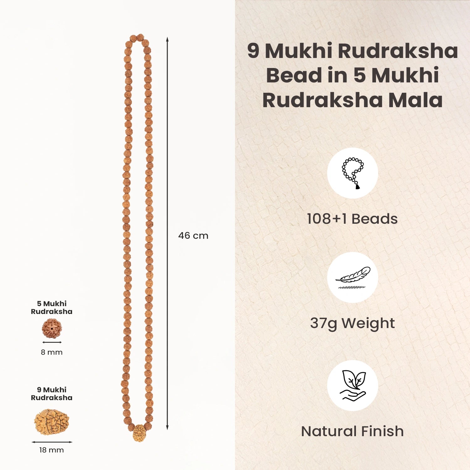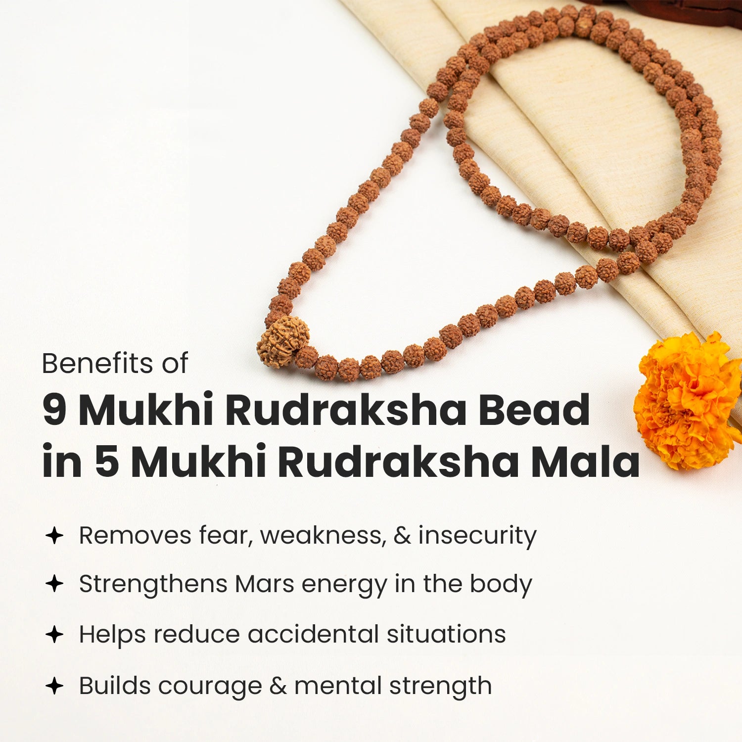 Prepaid orders are delivered on priority.This sacred Rudraksha mala carries the pure energy of Lord Shiva. It is made with 108 powerful Nepali-origin 5 Mukhi Rudraksha beads that bring calmness, protection, and balance, along with Nepali-origin 9 Mukhi Rudraksha, known for its blessings of Goddess Durga, the divine source of courage, inner strength, and fearlessness.