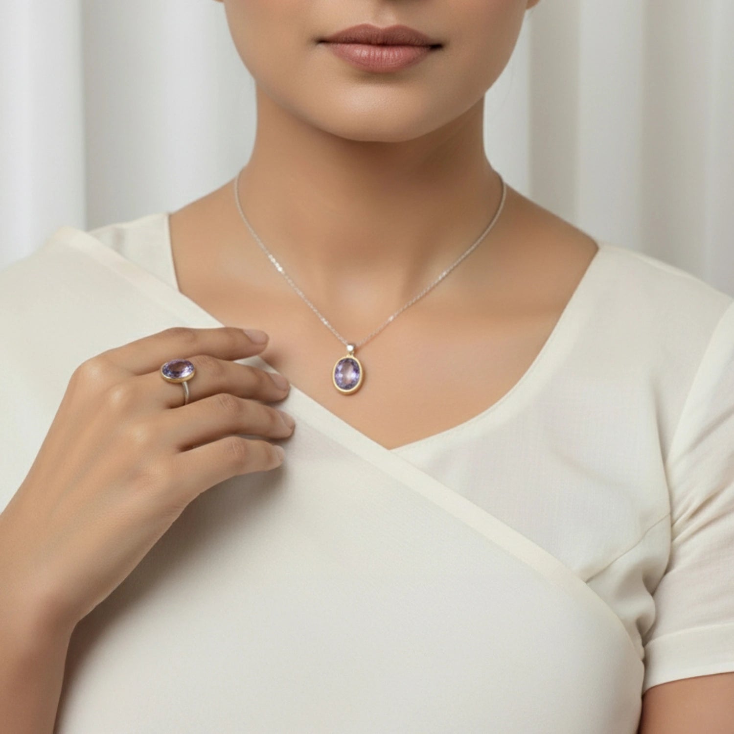 Amethyst is usually worn in Gold, Silver, or Panchdhatu rings or pendants. Panchdhatu metal can lose color with frequent contact with water, sweat, or perfume. Keep the ring dry to maintain its shine for a longer time.