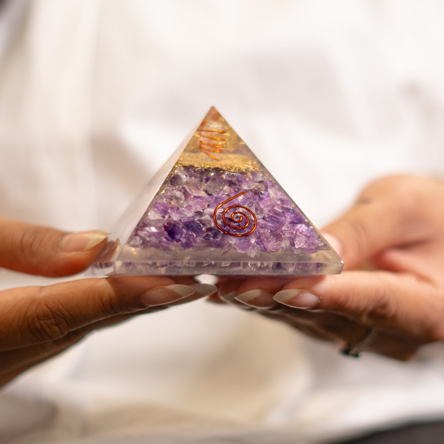 Amethyst Pyramid | ₹699The Orgonite Amethyst Pyramid blends amethyst, copper, resin, and sacred geometry to create a healing crystal tool with powerful energy transformation. It helps calms an overactive mind, reduces stress, and restores emotional balance. Known to activate the Third Eye and Crown Chakras, it boosts spiritual awareness and inner guidance.
