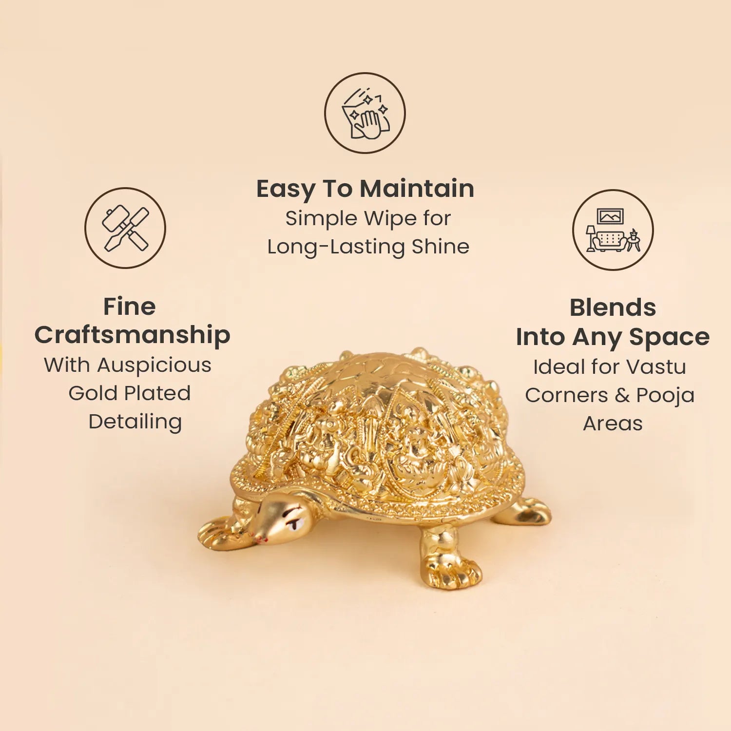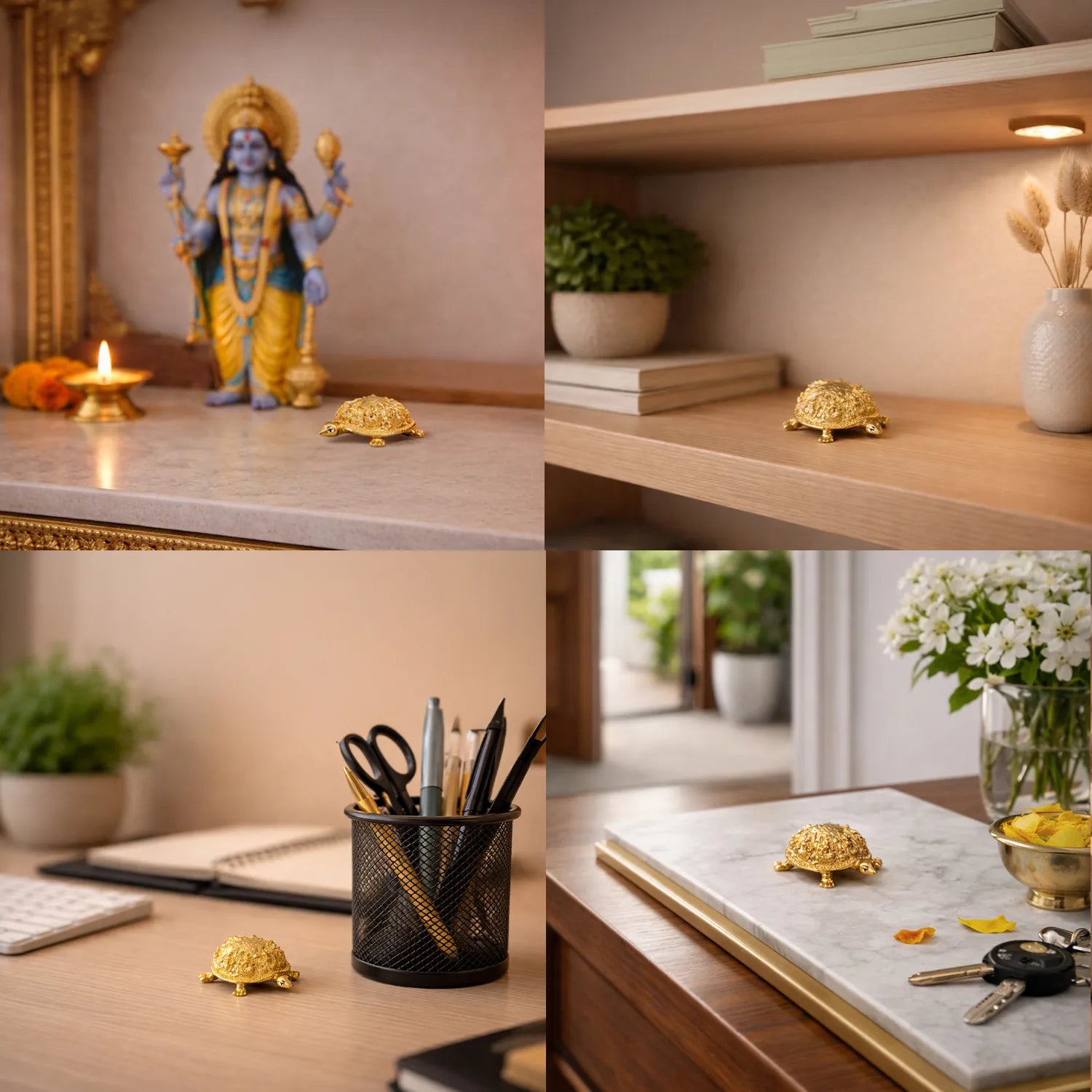 The combination makes it ideal for attracting financial stability and steady progress. Its golden finish enhances prosperity, making it suitable for puja rooms, work desks, cash areas, or lockers.