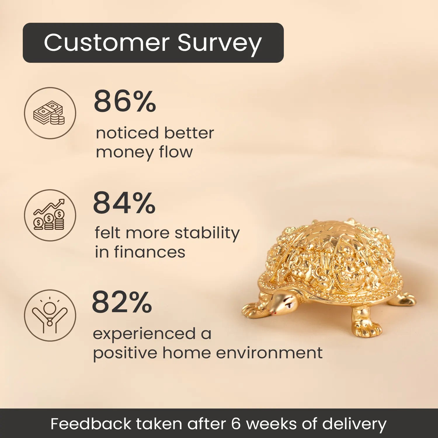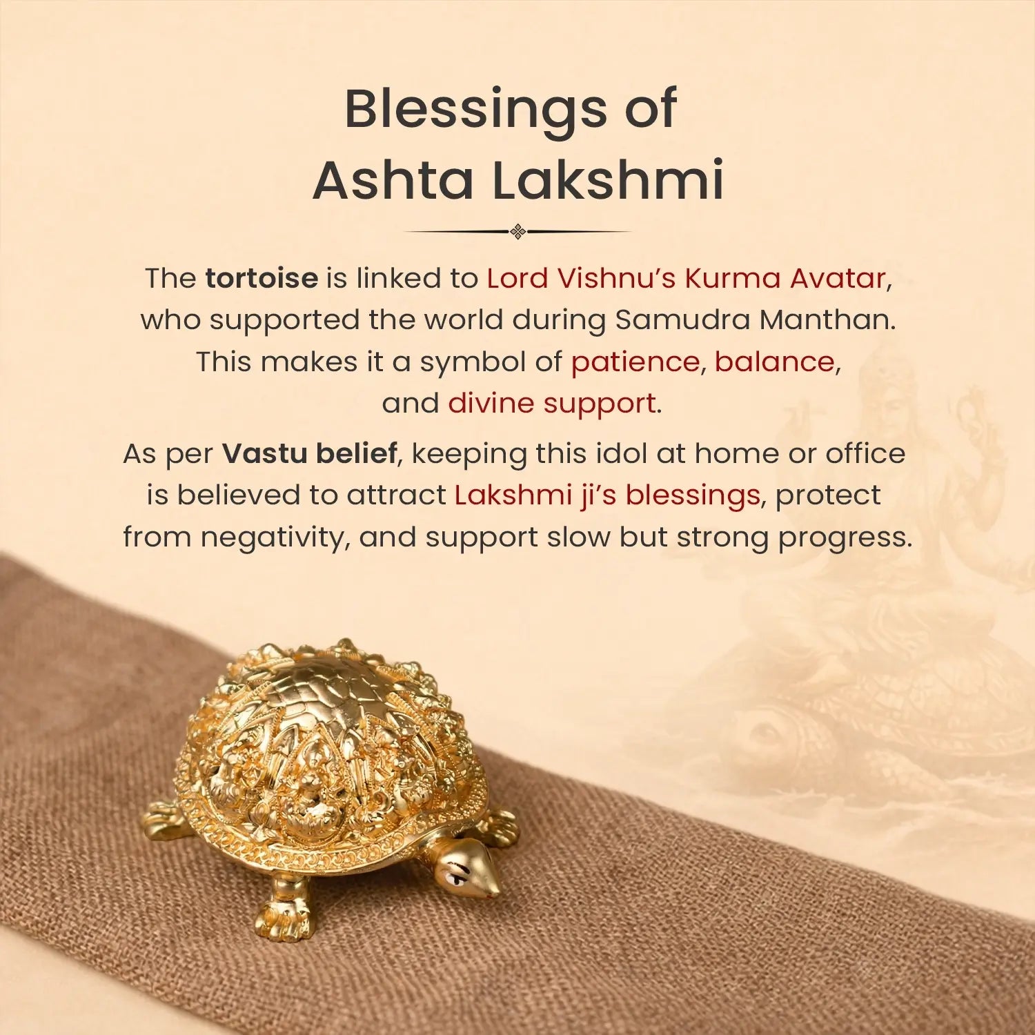Prepaid orders are delivered on priority.The Ashtalakshmi Tortoise Idol represents the blessings of the eight forms of Goddess Lakshmi, symbolising wealth, success, nourishment, courage, and overall prosperity.