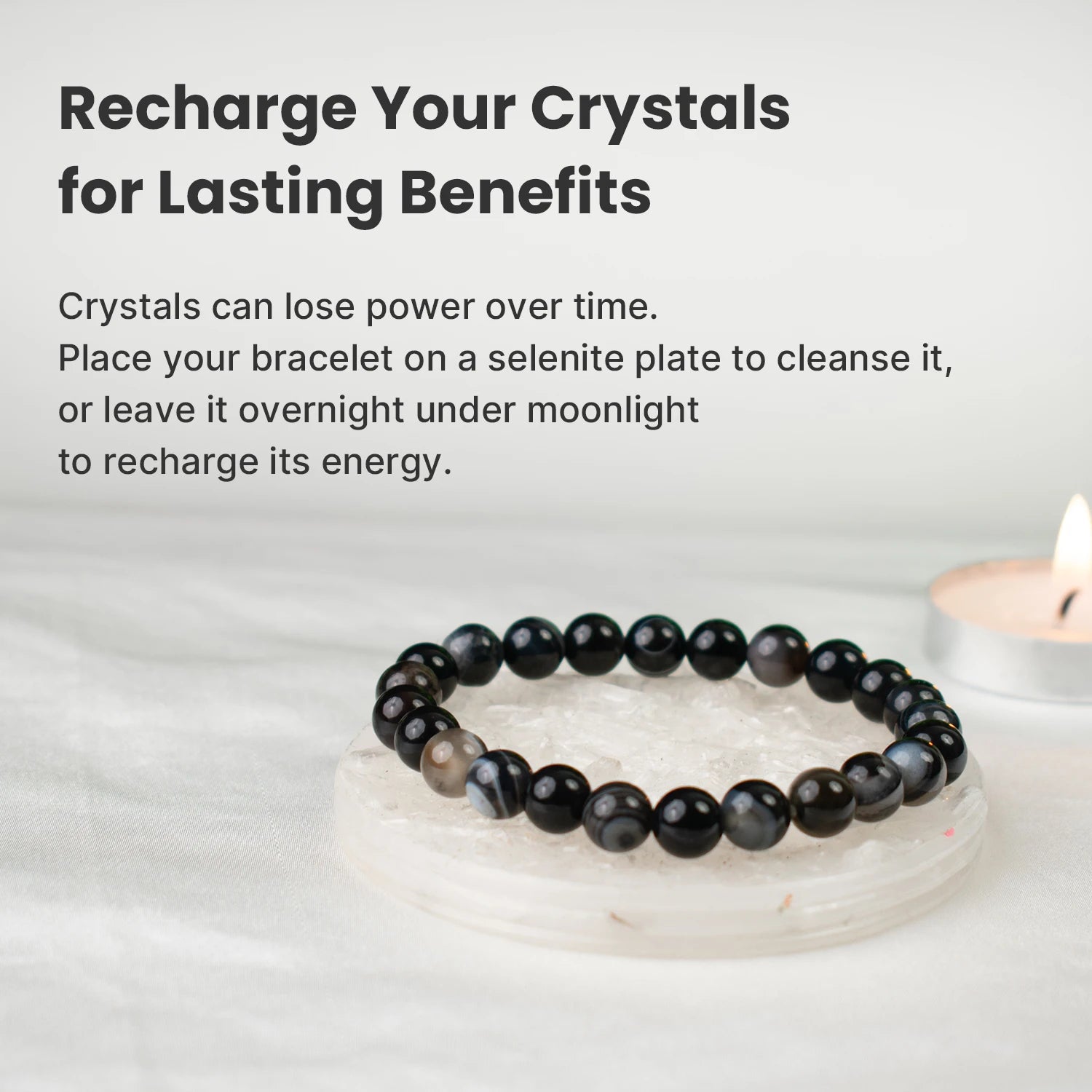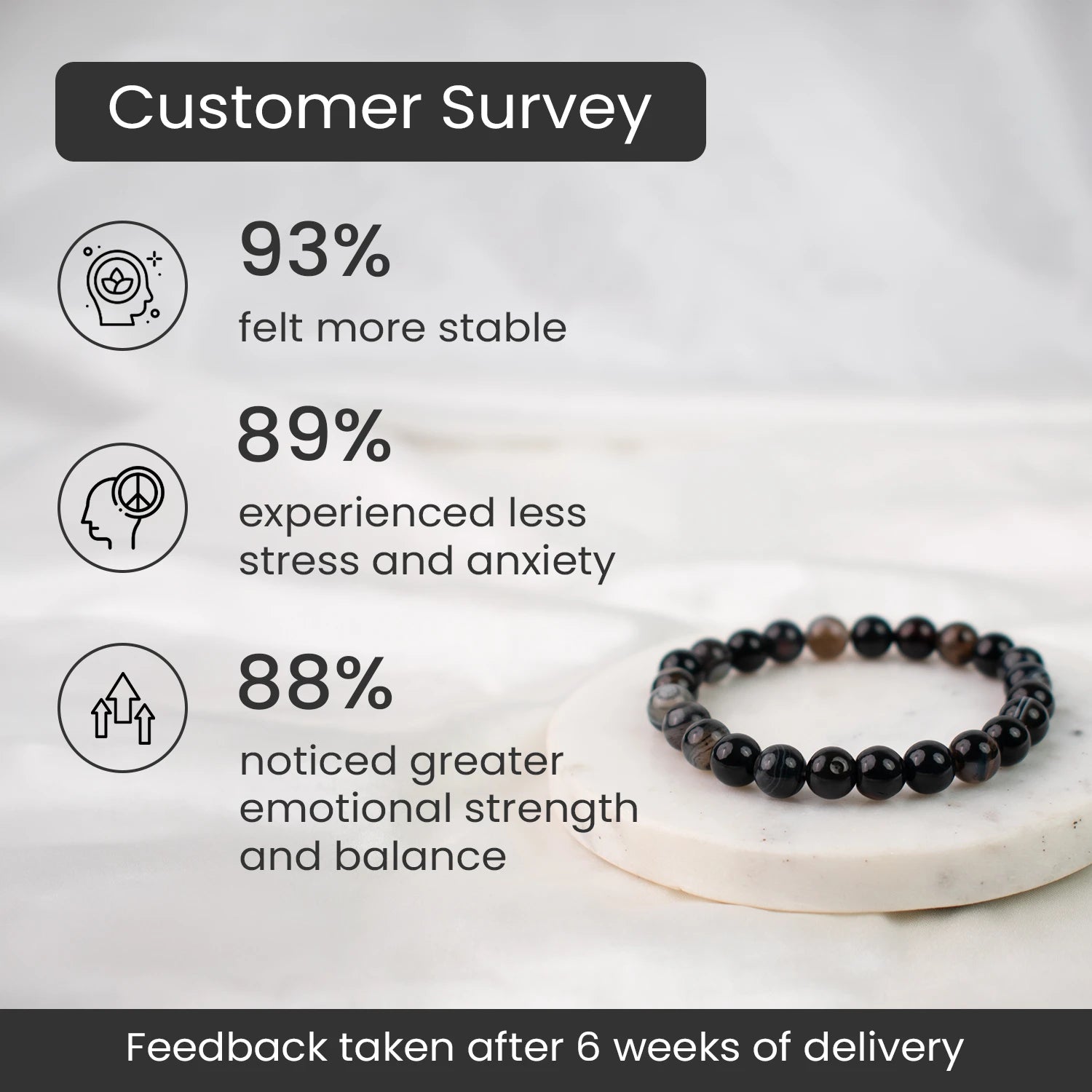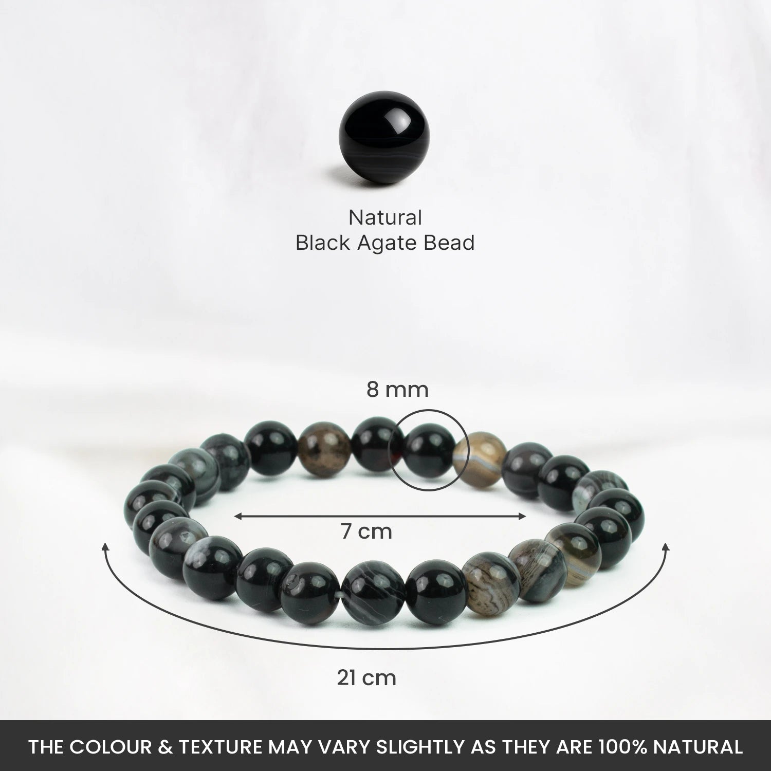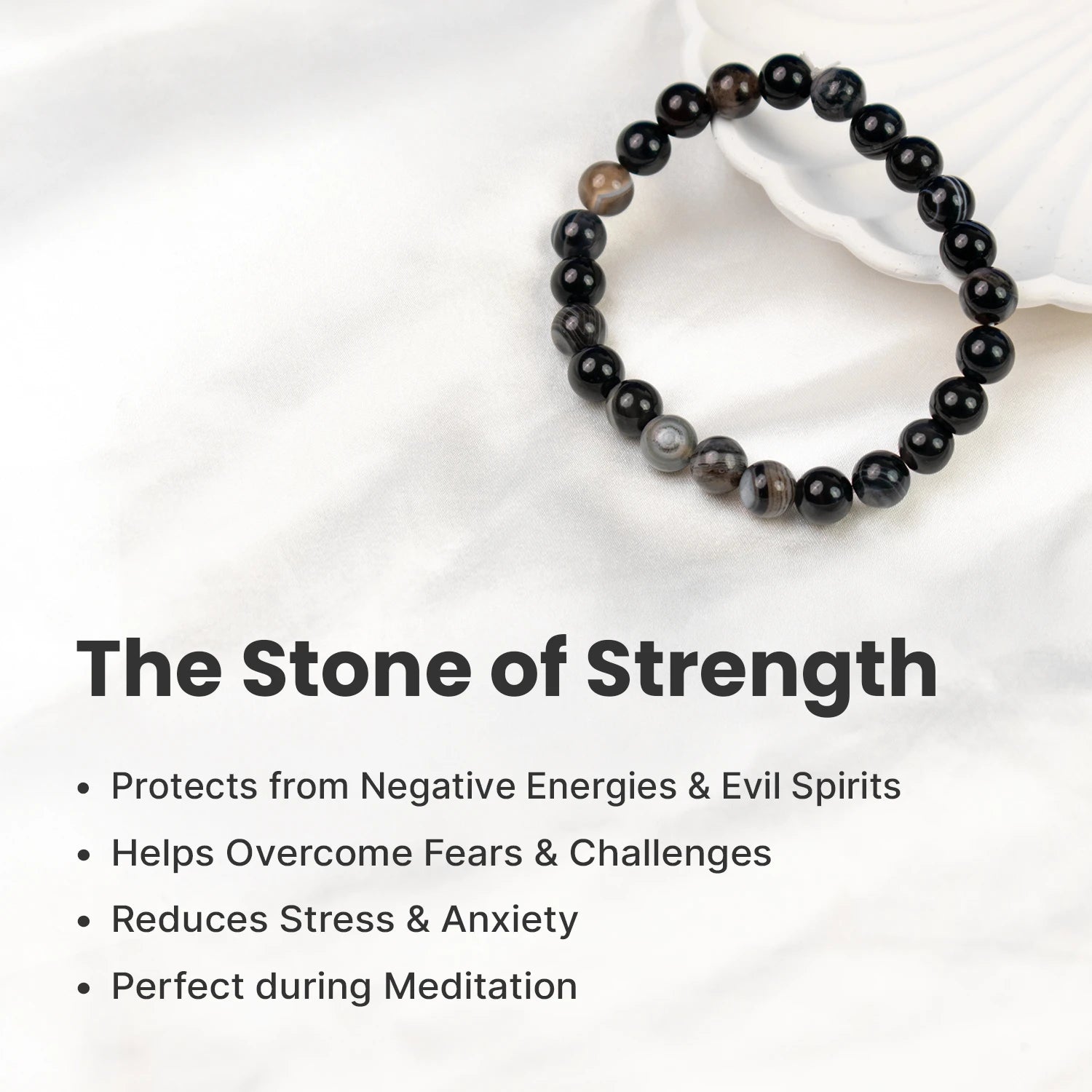 Black Agate BraceletThe Black Agate Bracelet is known as the Stone of Stability. It helps you stay calm even when life gets stressful, and it keeps your mind steady so you don’t feel anxious or confused.