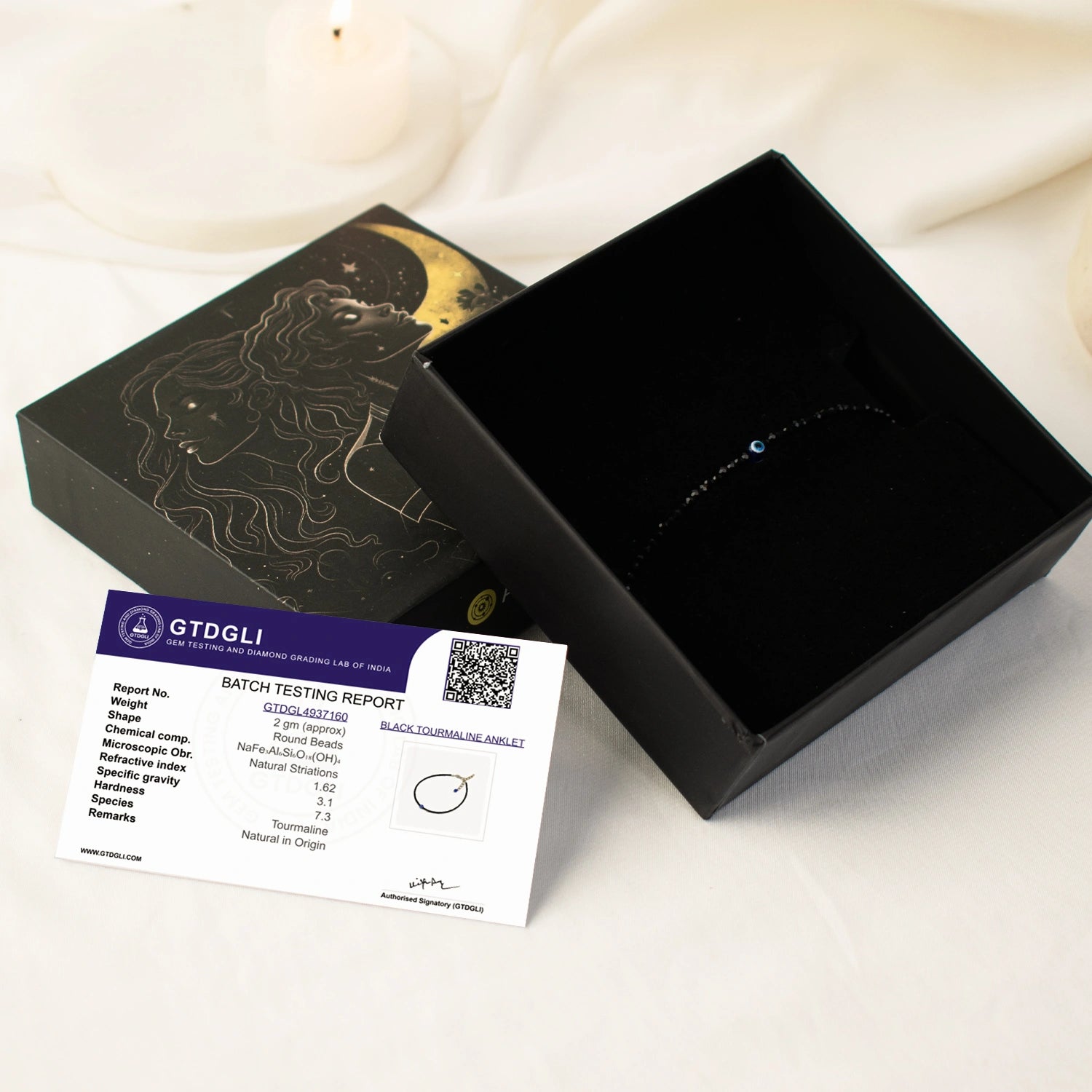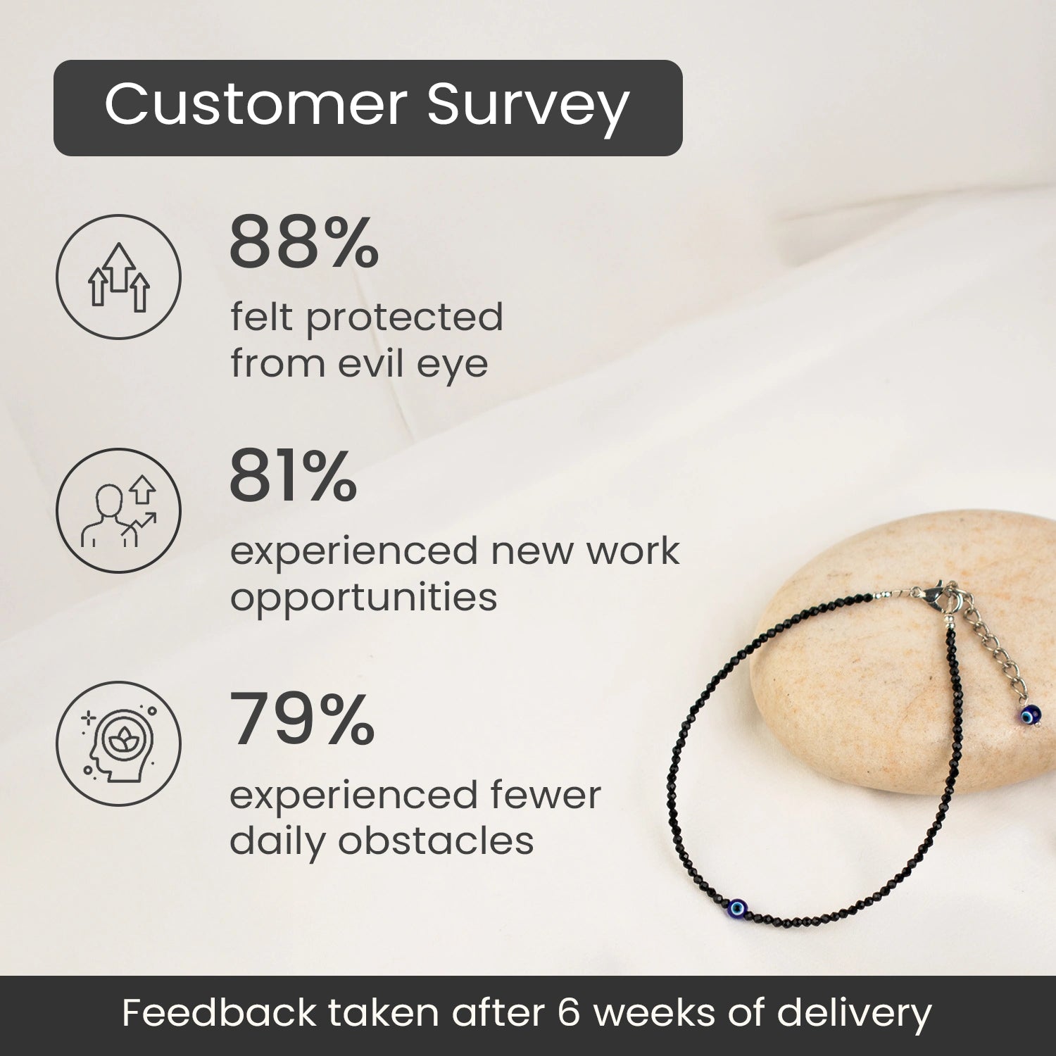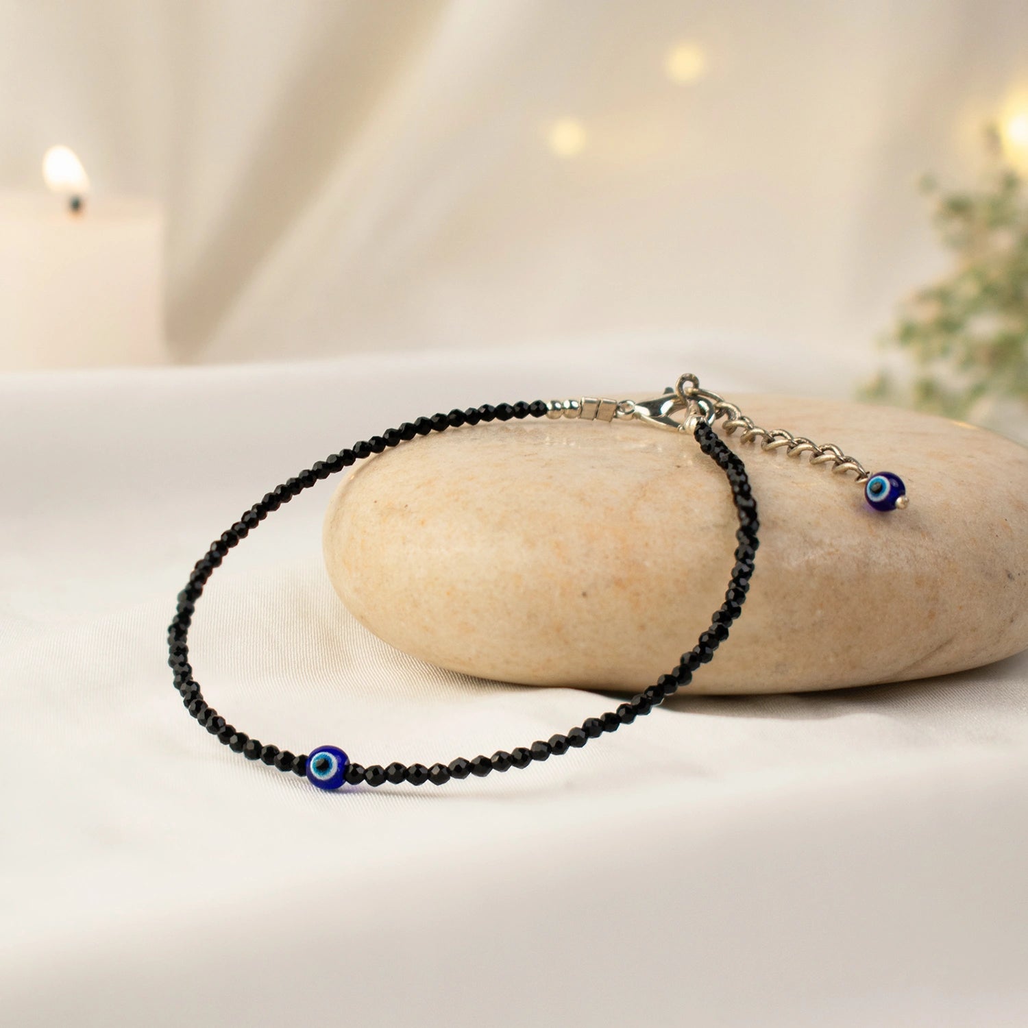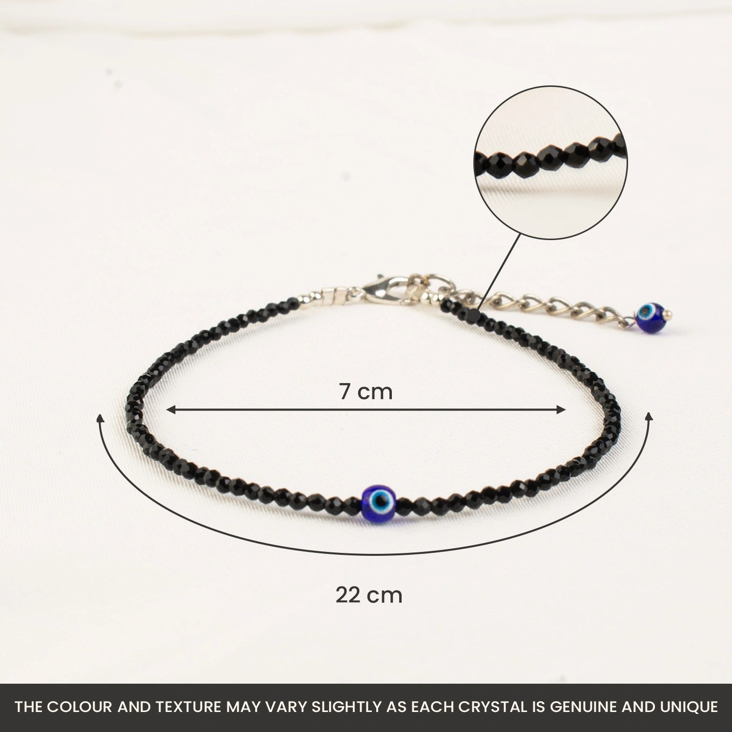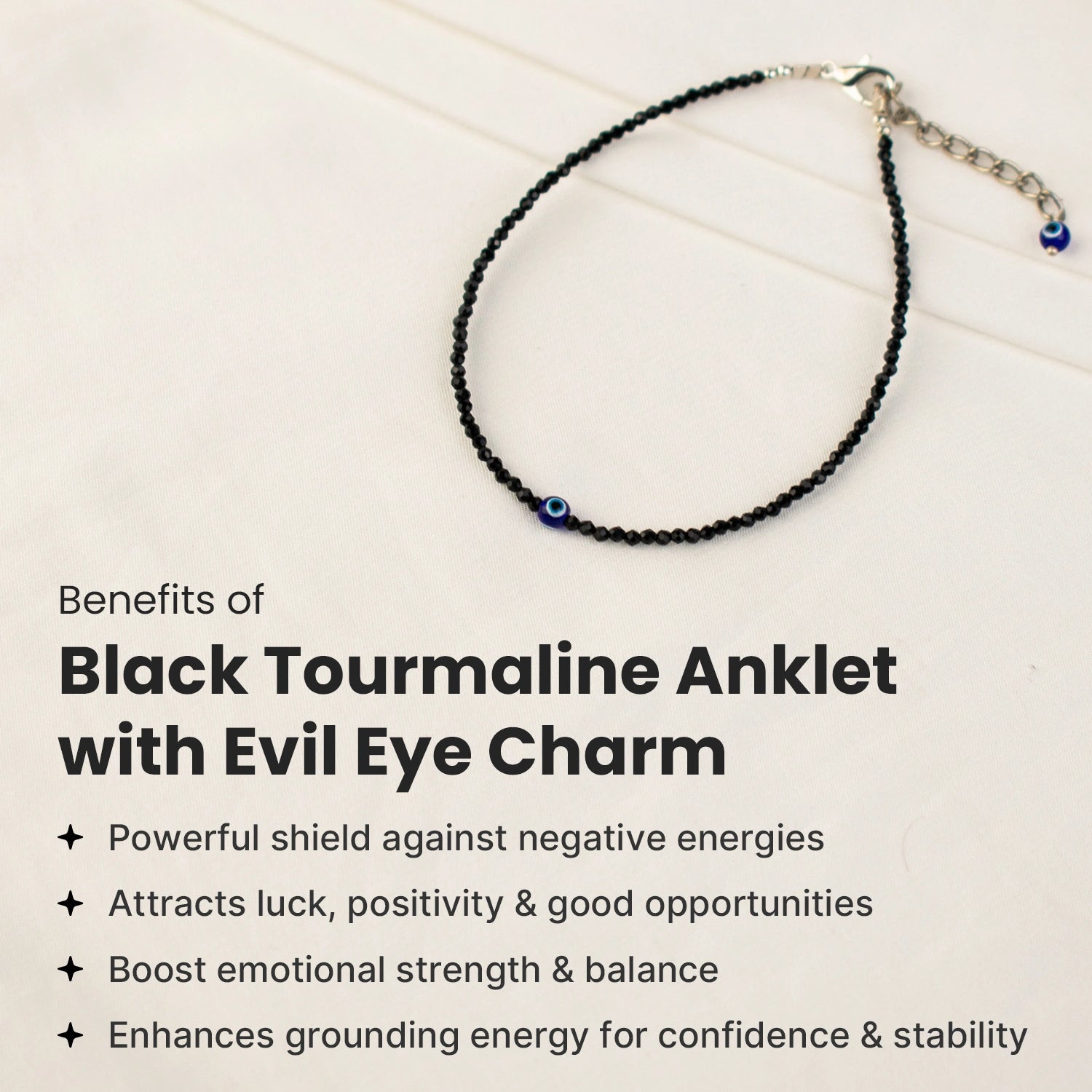 The anklet combines the powerful protection of Black Tourmaline with the Evil Eye charm, making it a strong spiritual shield against negativity and bad luck.
