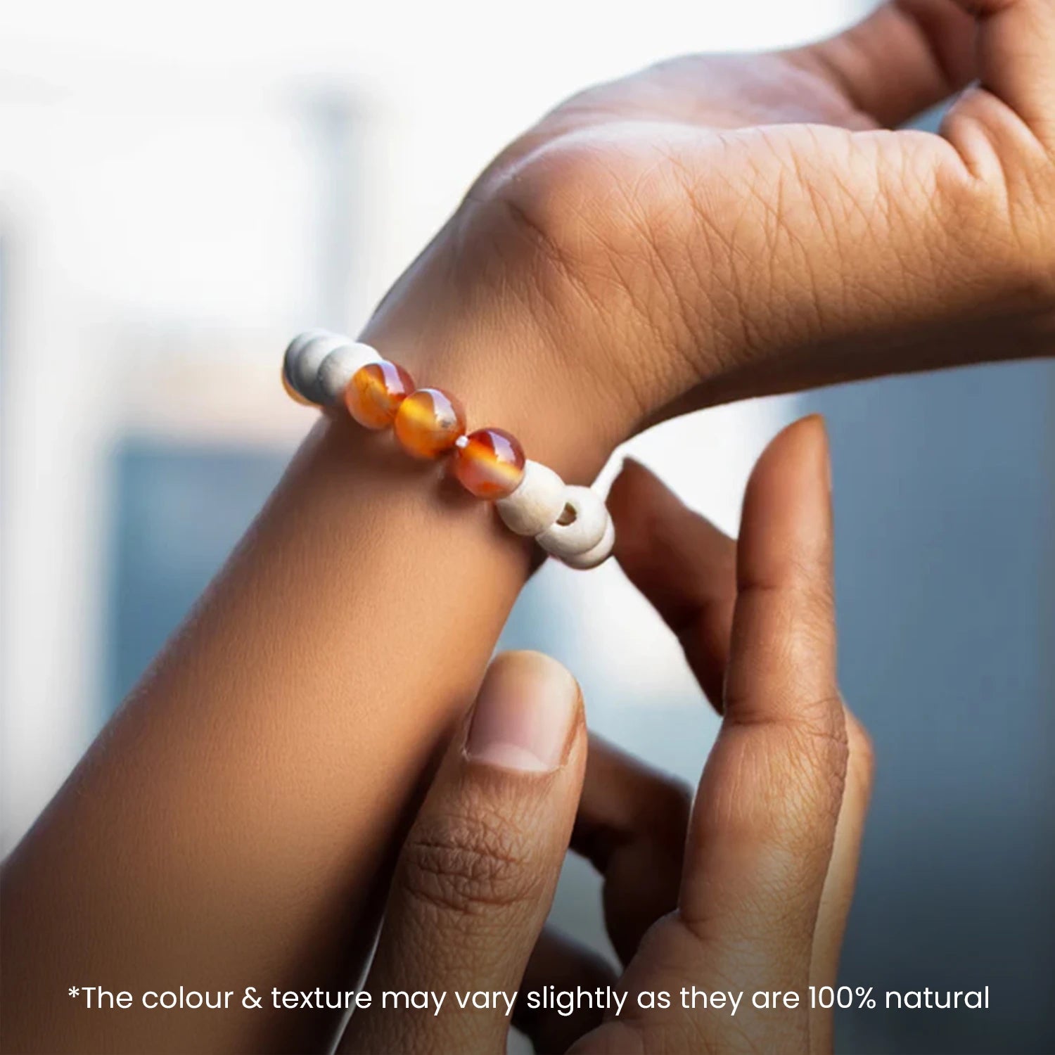 Prepaid orders are delivered on priority.Carnelian, a fiery orange crystal, boosts energy, creativity, and motivation. Its known to enhance confidence, passion, and courage. Wear Carnelian Tulsi Bracelet or carry a tumbled stone to ignite your inner fire and embrace lifes adventures with enthusiasm.