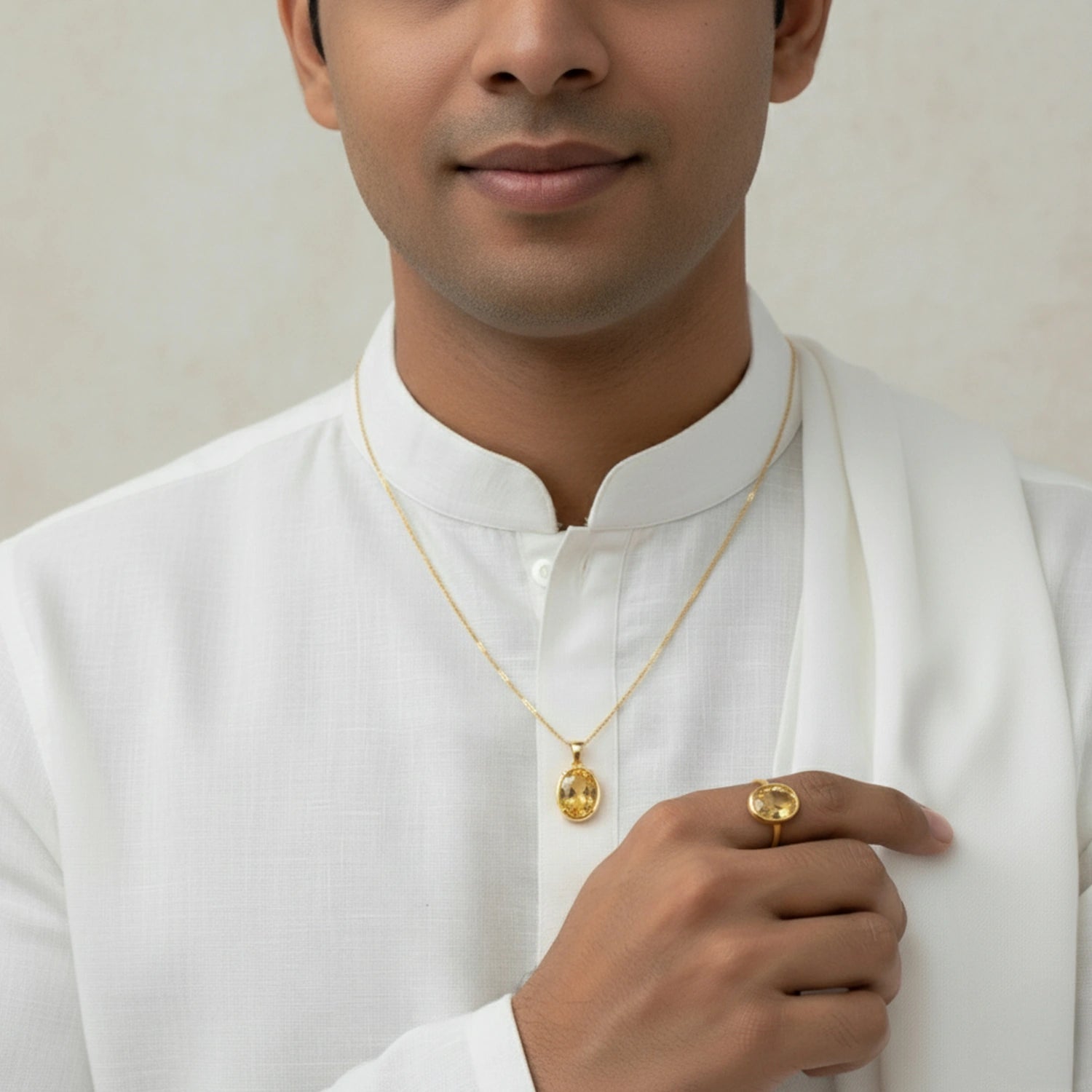 Citrine is usually worn in Gold, Silver, or Panchdhatu rings or pendants. Panchdhatu metal can lose color with frequent contact with water, sweat, or perfume. Keep the ring dry to maintain its shine for a longer time.