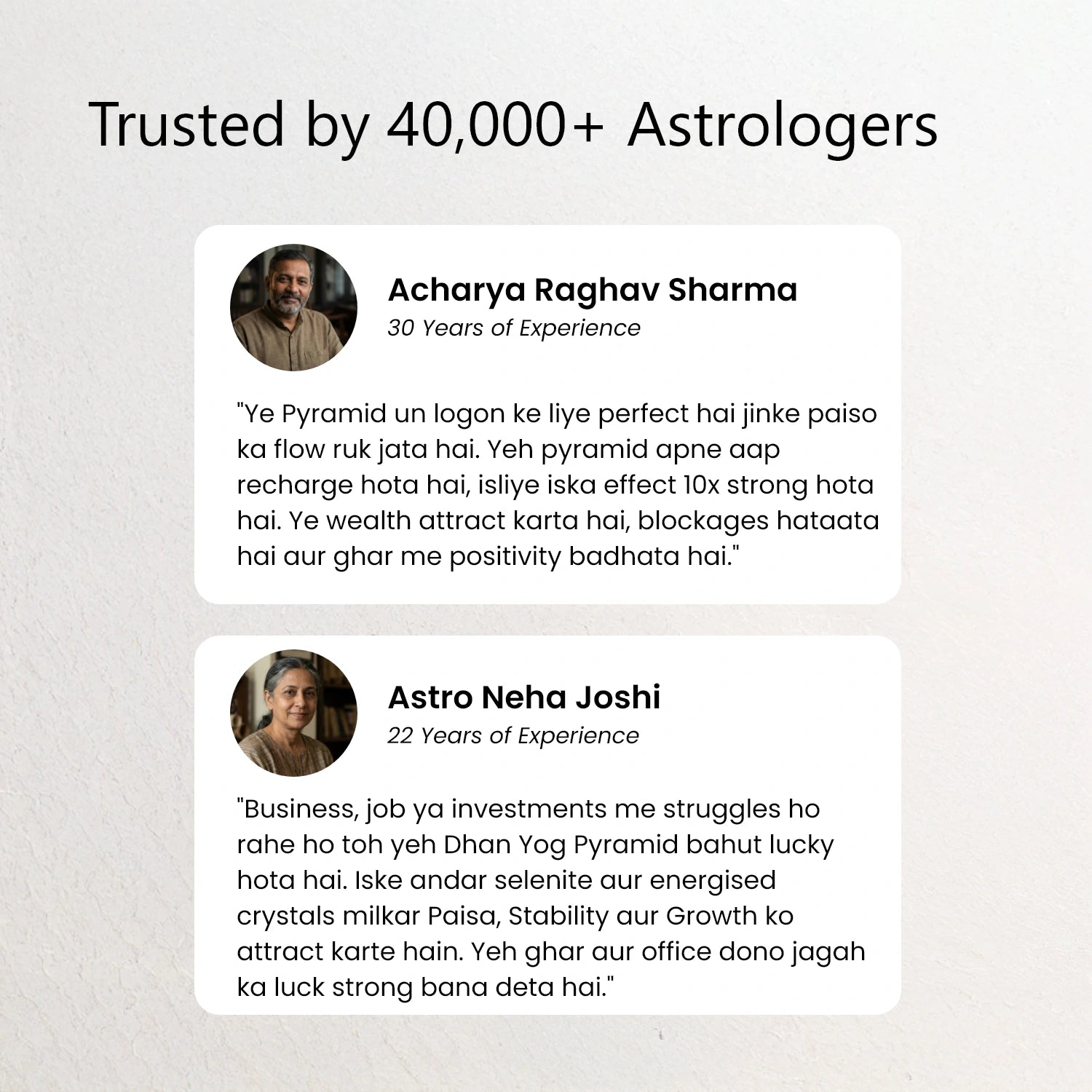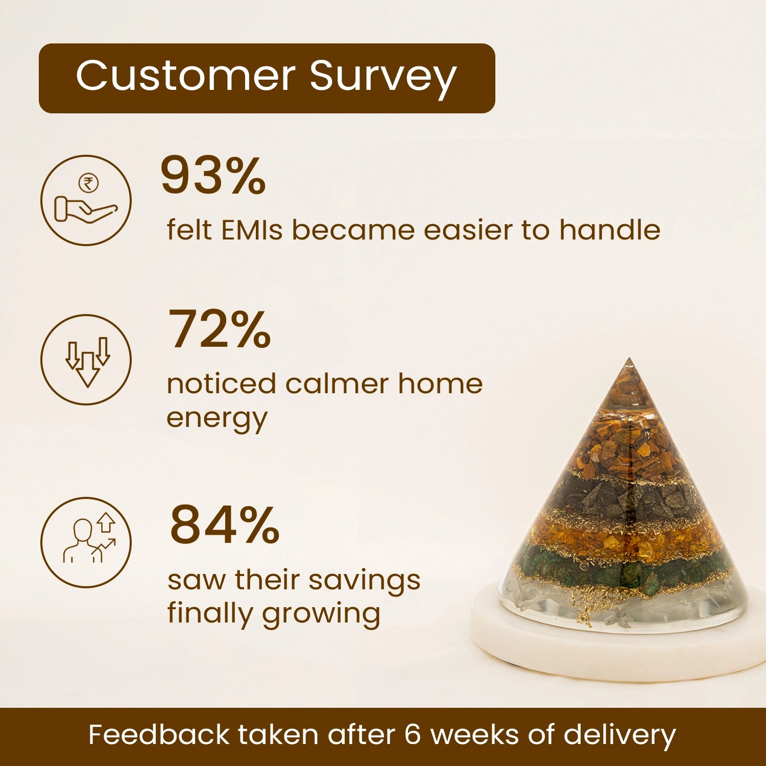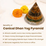 Conical Dhan Yog PyramidThe Conical Dhan Yog Pyramid is a powerful, self-recharging crystal pyramid that attracts money and boosts positivity. With five energised crystals and a natural Selenite crystal layer inside, it recharges the pyramid automatically, making its energy 10x more powerful and active at all times.