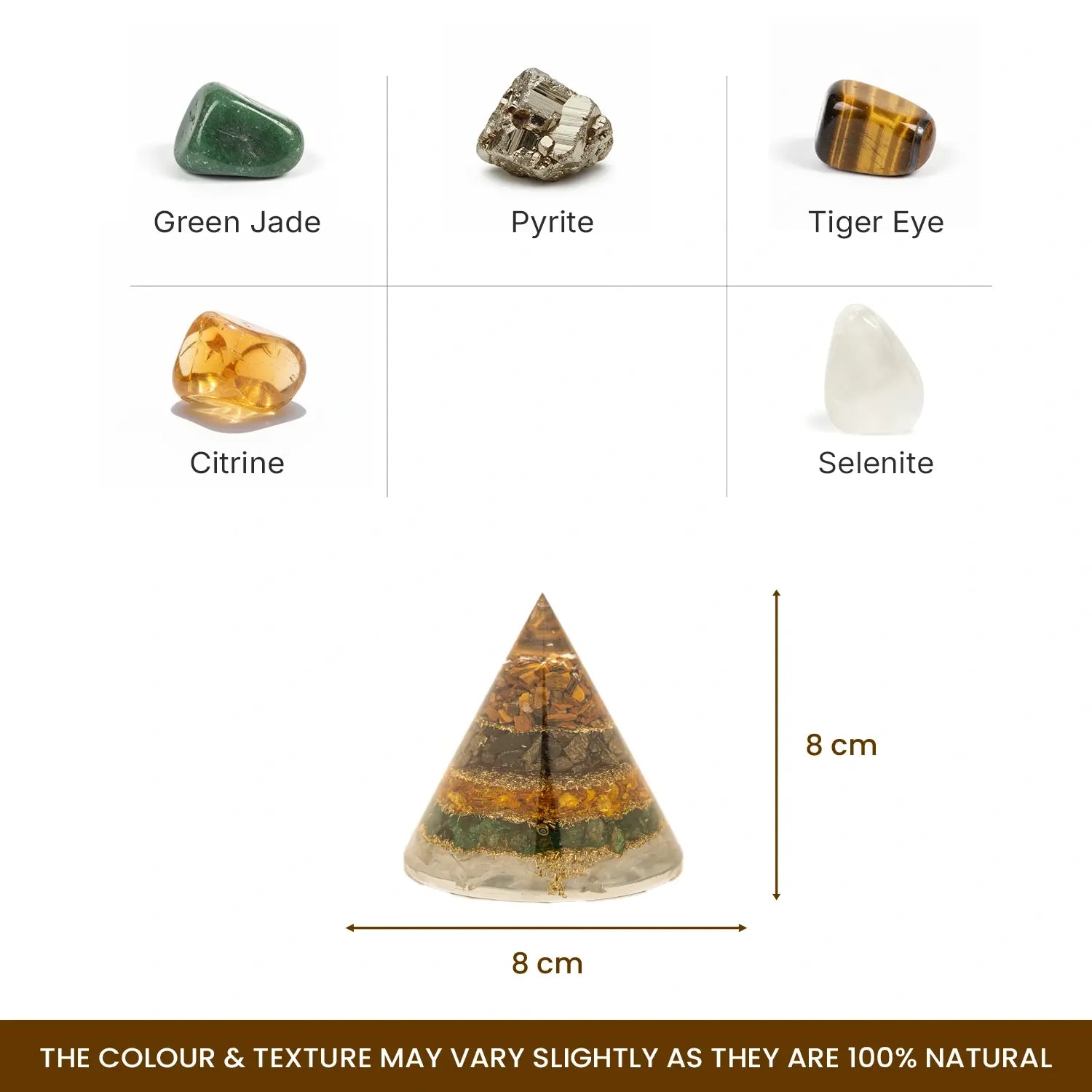 Prepaid orders are delivered on priority.The Conical Dhan Yog Pyramid is a powerful, self-recharging crystal pyramid that attracts money and boosts positivity. With five energised crystals and a natural Selenite crystal layer inside, it recharges the pyramid automatically, making its energy 10x more powerful and active at all times.