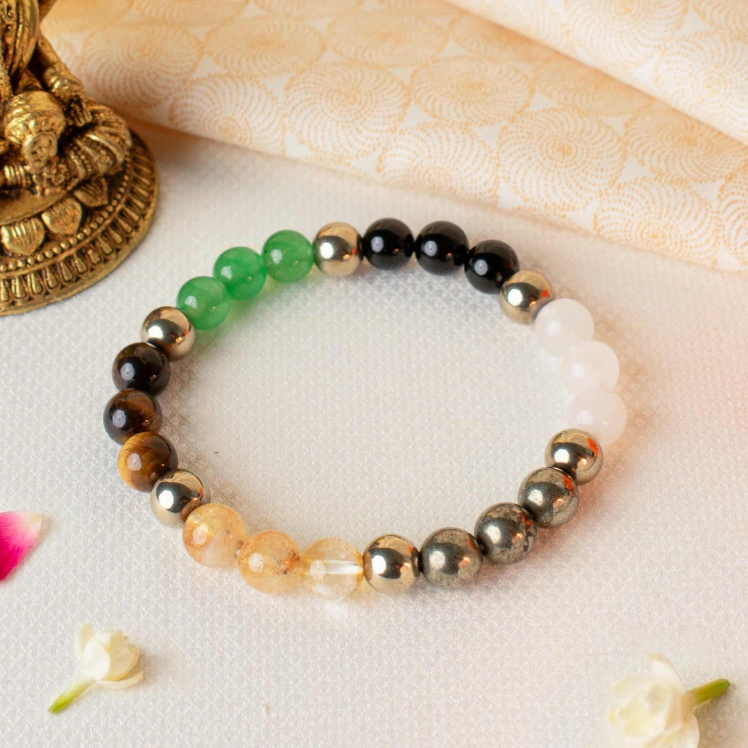 The bracelet is crafted with carefully selected wealth and protection crystals such as Pyrite, Citrine, Green Aventurine, Black Obsidian, Quartz, Tiger Eye, and Hematite, known for supporting confidence, discipline, and financial clarity.
