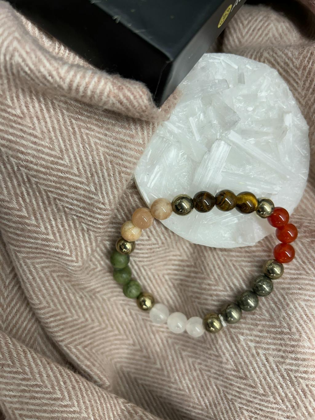 Prepaid orders are delivered on priority.The Dhan Vriddhi with FREE Raw Selenite Plate Combo is the perfect set to bring growth, wealth, and happiness into your life while keeping your bracelet fully charged at all times. The Dhan Vriddhi Bracelet is crafted with 6 powerful crystals – Pyrite, Jade, Sunstone, Tiger Eye, Quartz, and Red Carnelian – that work together to attract money, boost luck, improve health, strengthen relationships, and create overall balance.