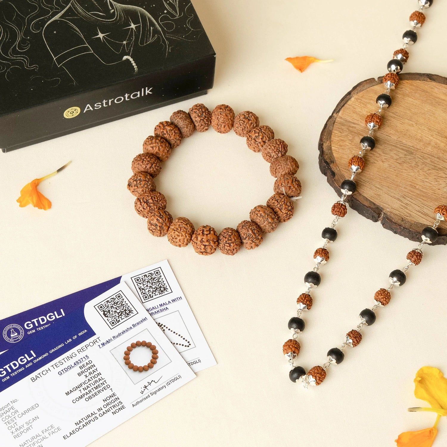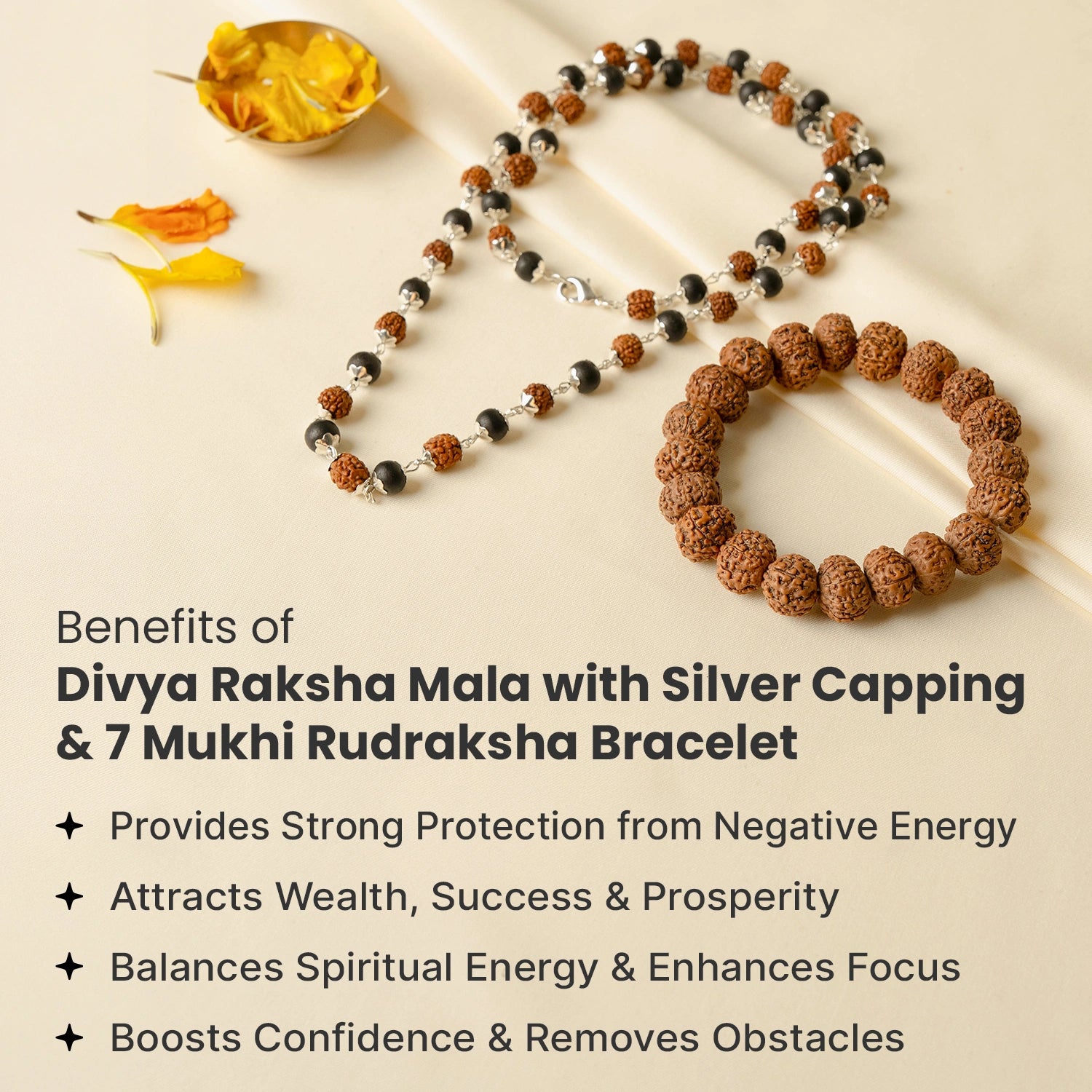 The Karungali & Rudraksha Mala offers protection from negativity and enhances spiritual awareness with blessings from Lord Shiva and Lord Murugan. The FREE 7 Mukhi Rudraksha Bracelet attracts wealth, stability, and prosperity, blessed by Goddess Mahalakshmi.