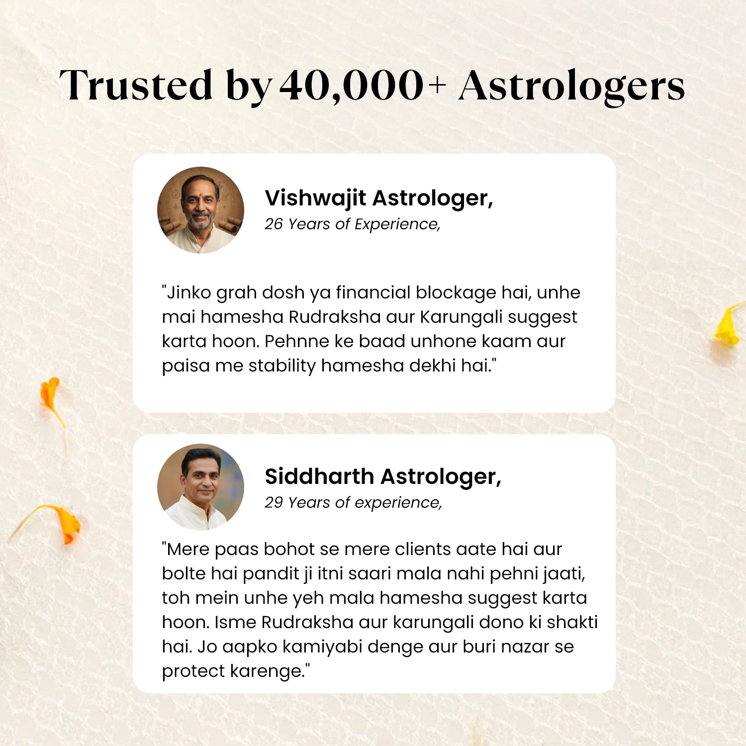 Prepaid orders are delivered on priority.The Divya Raksha Combo is a sacred blend of spiritual protection and divine prosperity. The Karungali & Rudraksha Mixed Mala carries the blessings of Lord Shiva and Lord Murugan, offering protection from negativity, buri nazar, and restless thoughts, while deepening meditation and spiritual awareness.