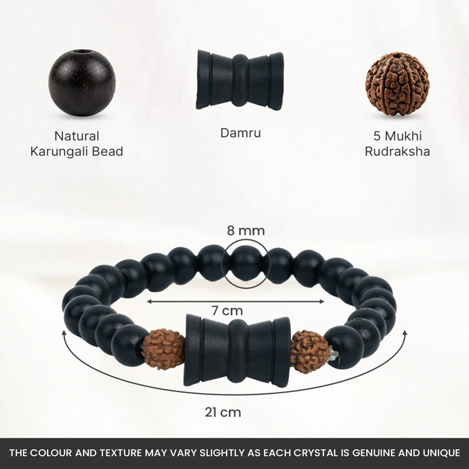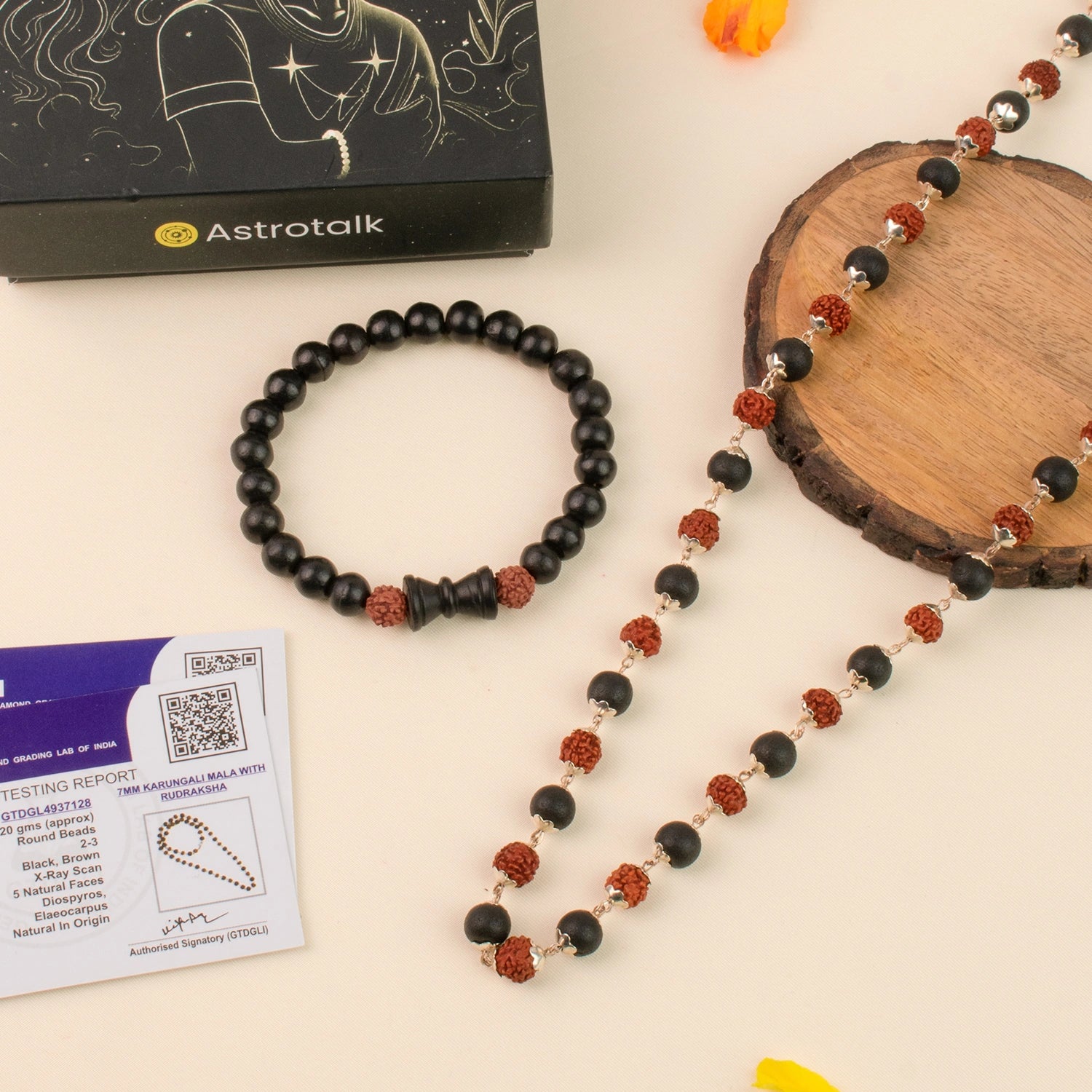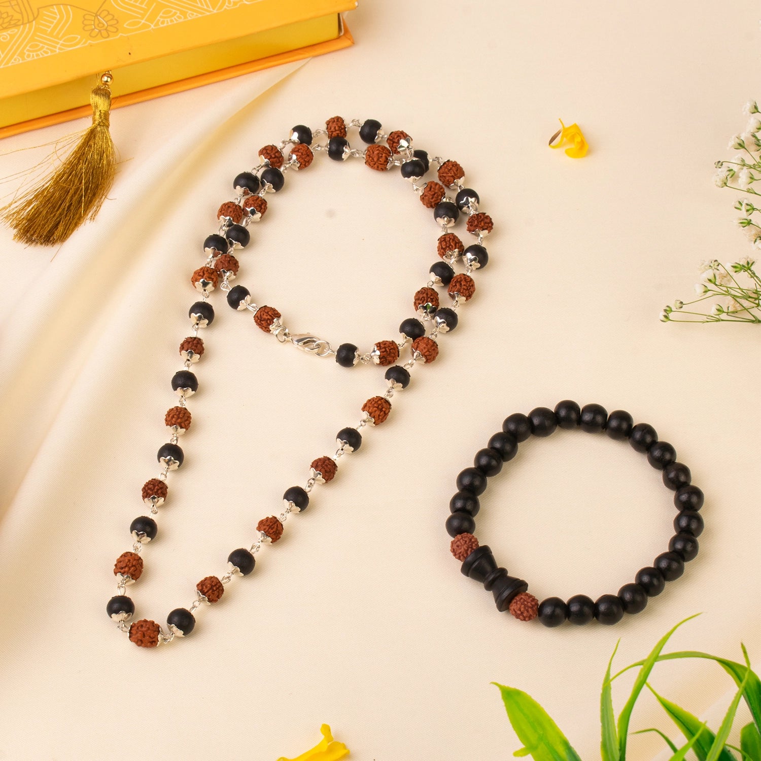 This combo includes the Divya Raksha Rudraksha & Karungali Mala with Silver Capping and the Rudraksha Karungali Healing Bracelet with Damru. Together, they bring the grounding power of Karungali (Black Ebony Wood), the divine blessings of 5 Mukhi Rudraksha, and the sacred symbolism of Shiv Ji’s Damru.