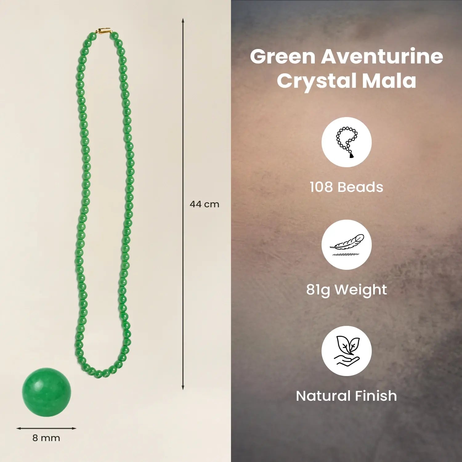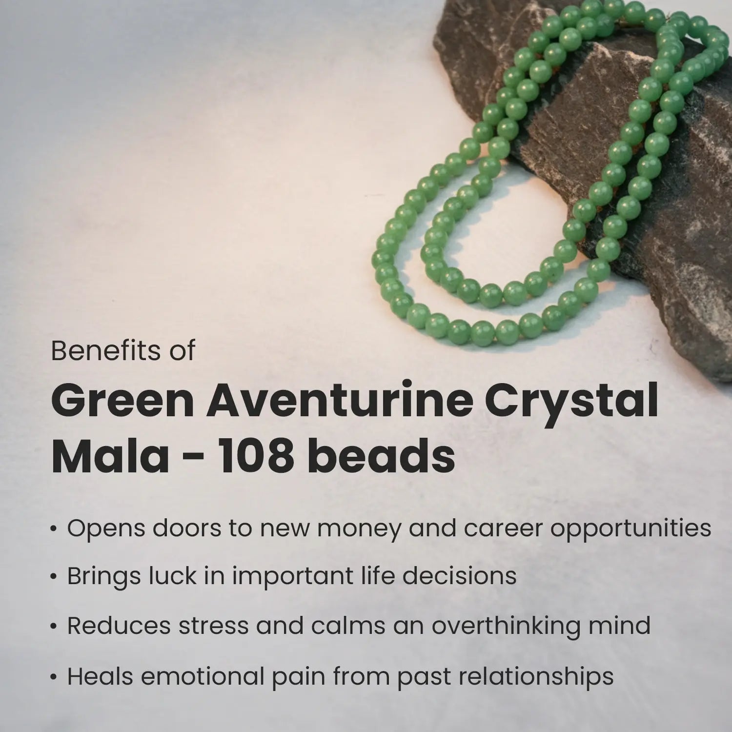 Prepaid orders are delivered on priority.This Green Aventurine Mala (8mm, 108 beads) is made from natural Green Aventurine, also known as the “Stone of Opportunity.” It is one of the luckiest crystals and is known for bringing good fortune and financial growth.