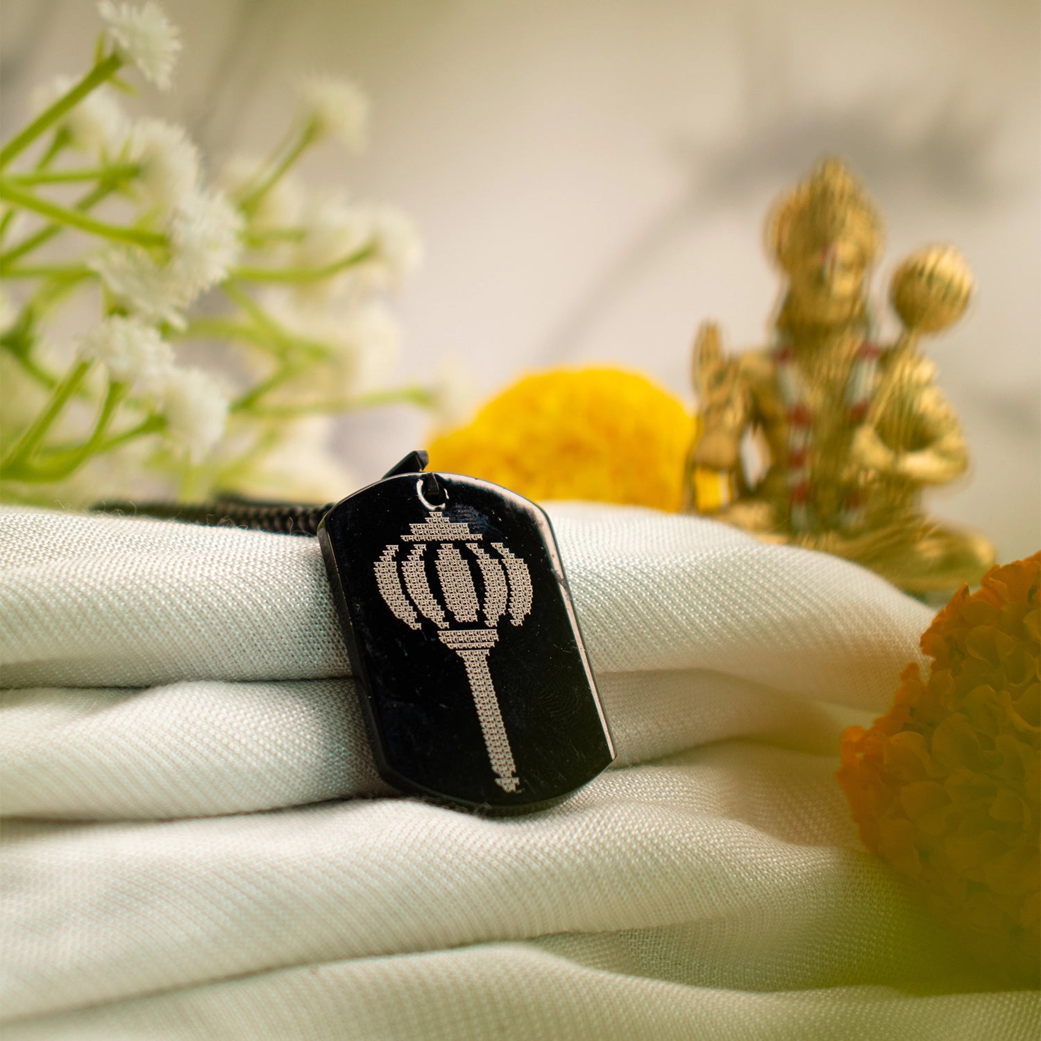 Prepaid orders are delivered on priority.Get the strength of Hanuman and the power of Ram Naam with this unique Hanuman Ji Gada kavach. The image of Hanuman's mighty Gada is intricately formed using micro-engravings of Ram Naam. Wear this Kavach for divine protection, immense courage, and victory over obstacles.