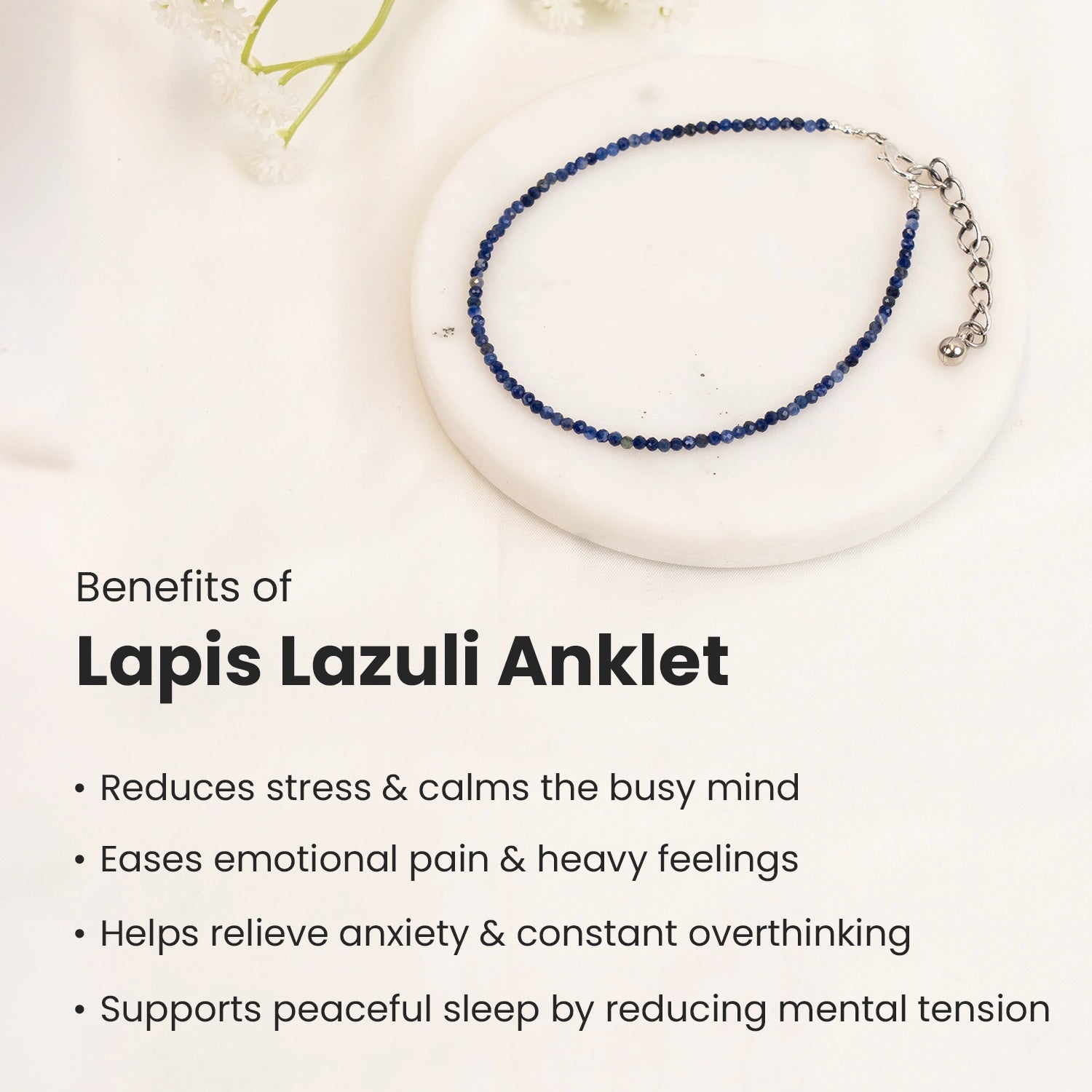 Lapis Lazuli AnkletLapis Lazuli is known as the "Stone of Wisdom and Truth". It helps you stay calm, think clearly, and feel confident from the inside. Its pretty blue hue makes it elegant and adds beauty to any outfit. At the same time, the crystals help with clarity, making better decisions & staying emotionally strong.