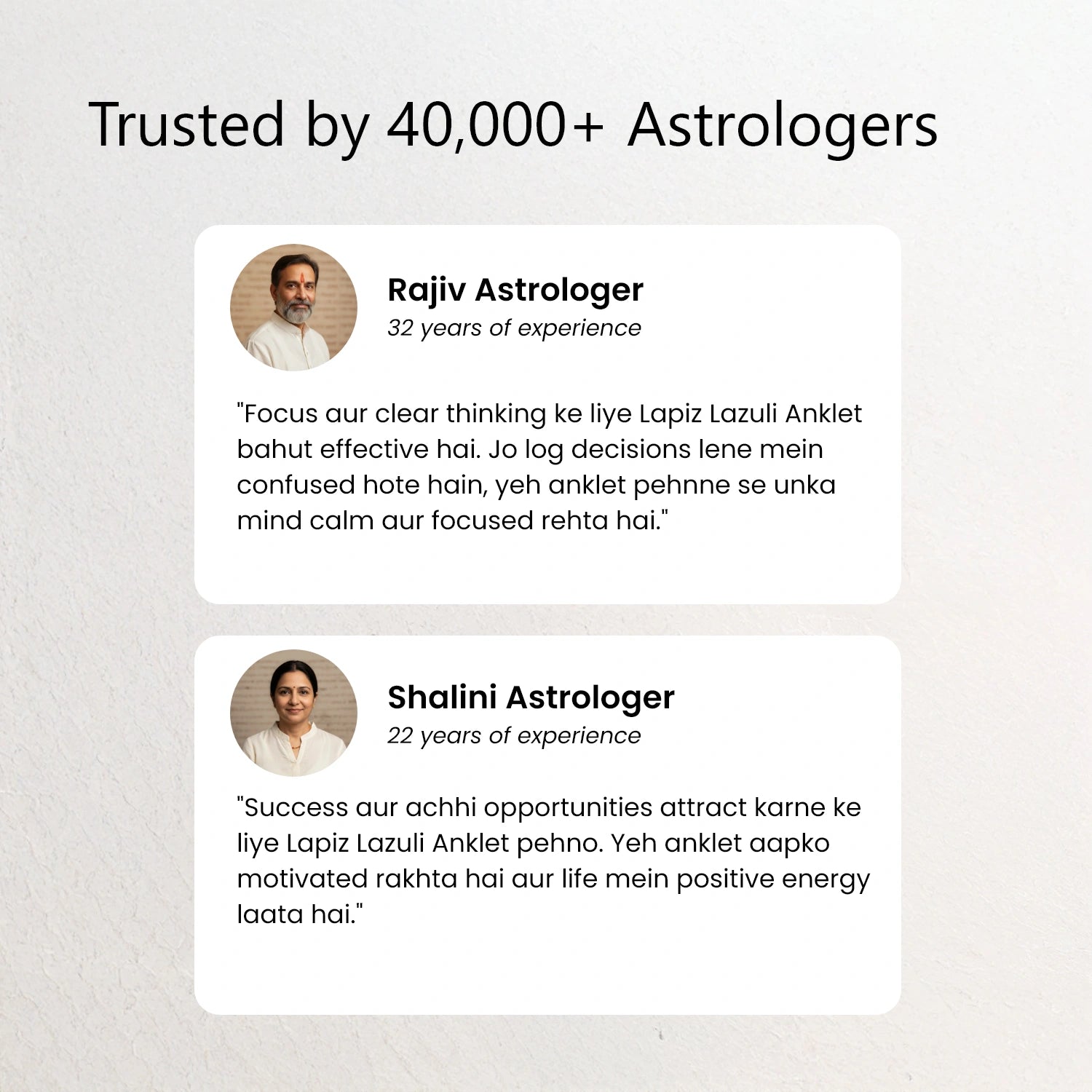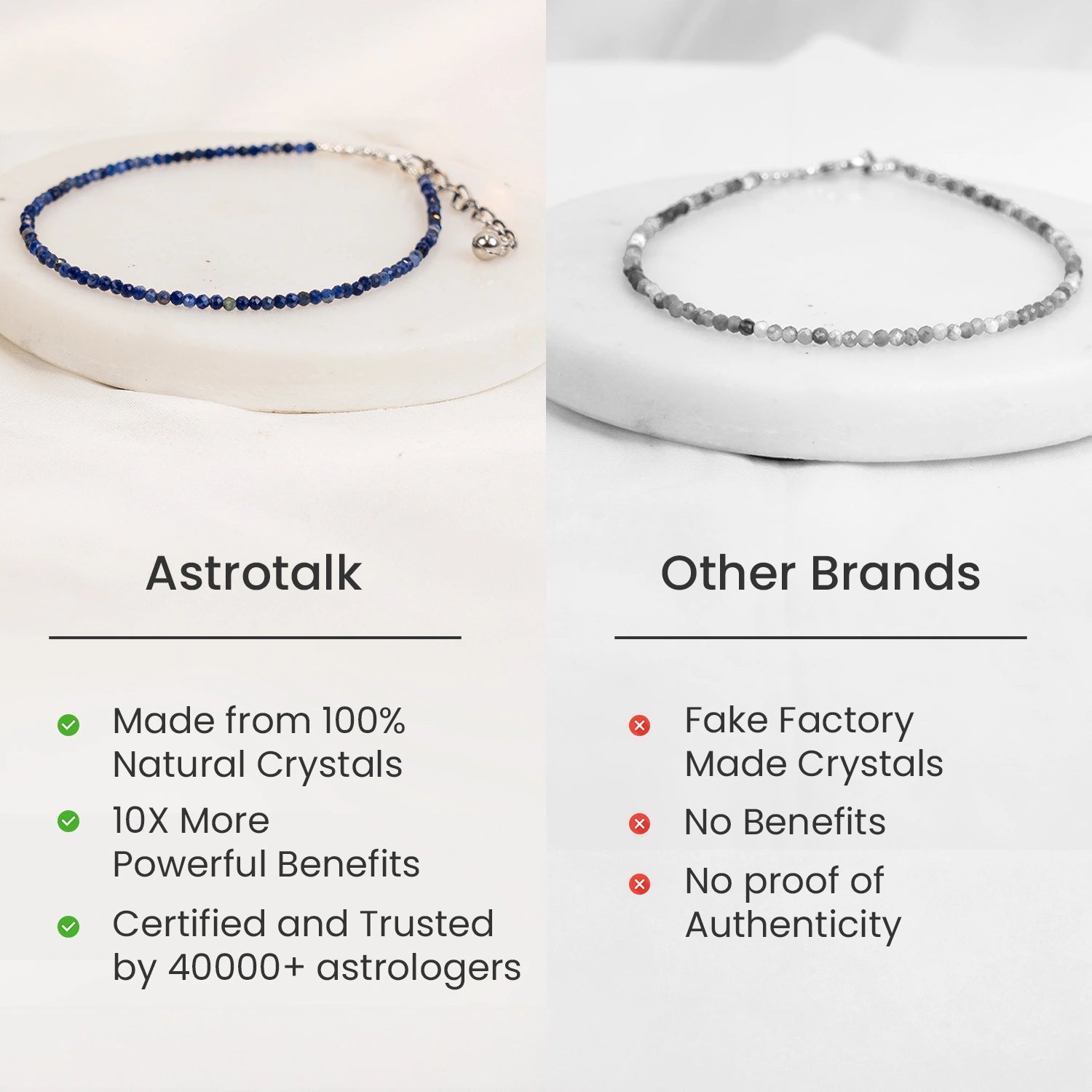 Lapis Lazuli is linked to Jupiter (Guru) and helps reduce the negative effects of Guru Dosh, which can cause confusion, low confidence, and emotional or financial stress. Wearing this anklet brings mental calmness, wisdom, good luck, spiritual growth, and protects you from negative energy and buri nazar.