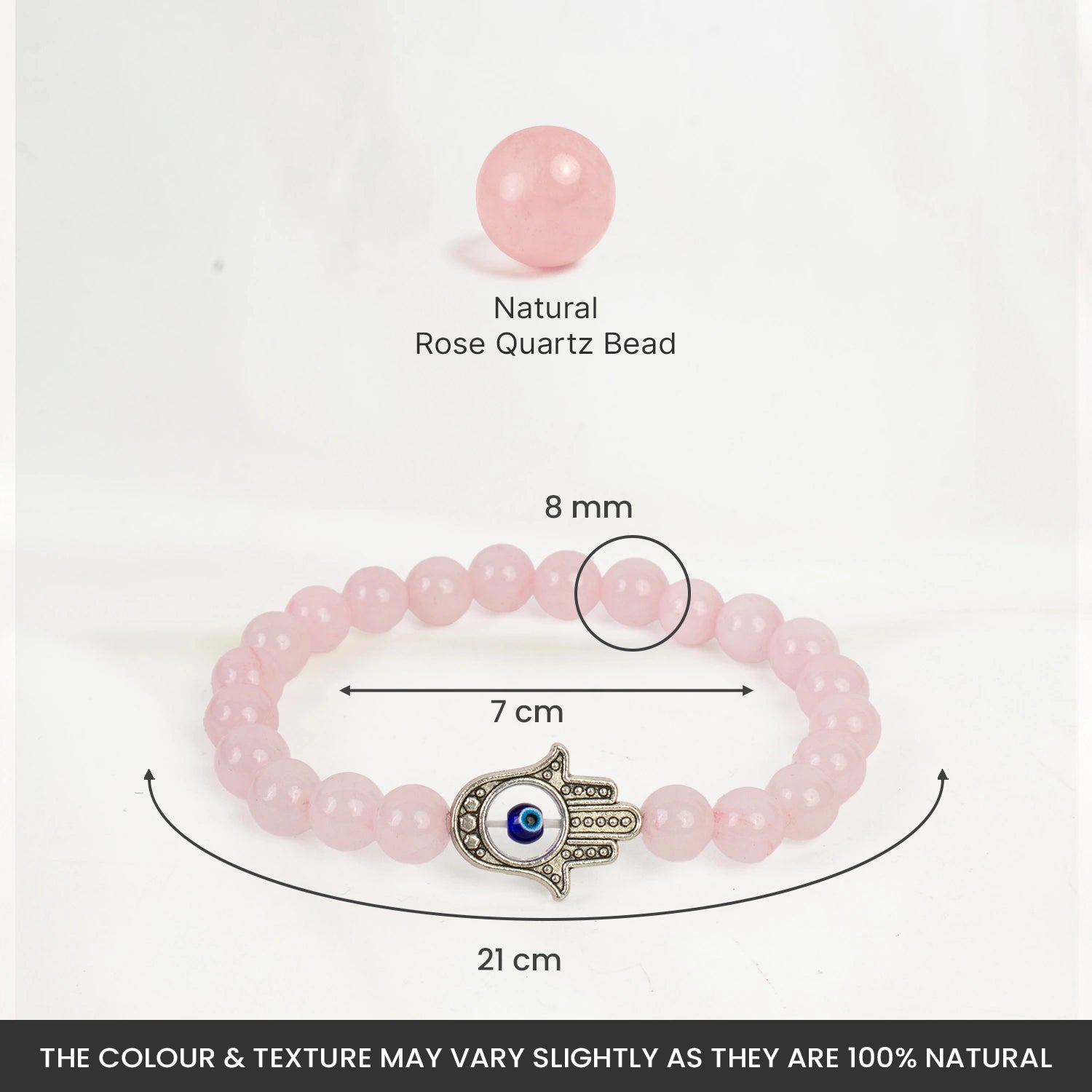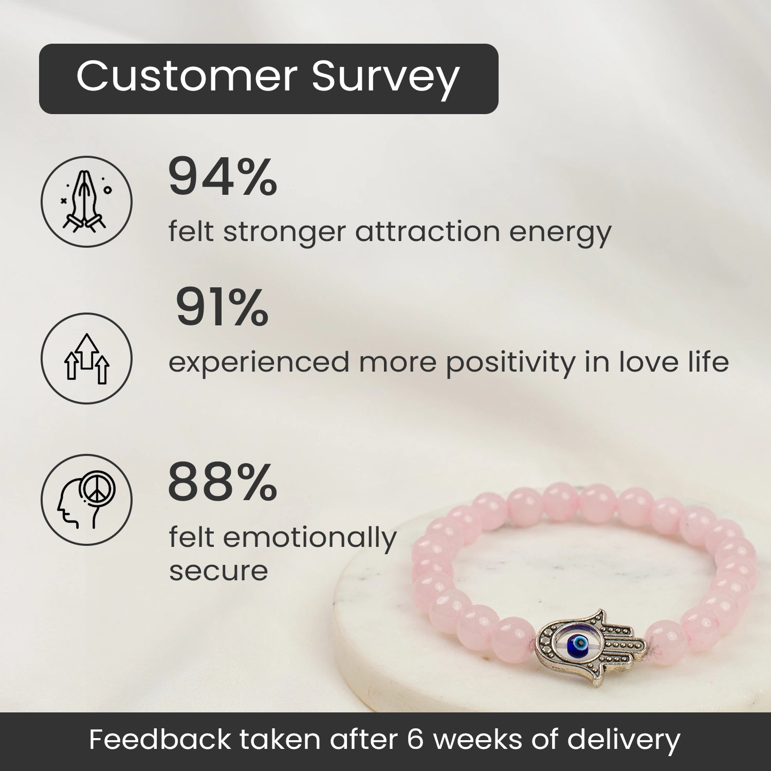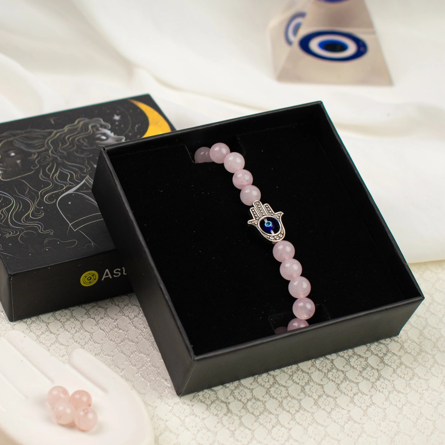 Love Attraction with Evil Eye Hamsa BraceletThe Love Attraction with Evil Eye Hamsa Bracelet is designed to attract love and positivity into your life. Made with soothing pink rose quartz crystals, it helps open your heart to love, strengthen relationships, and boost self-love. The evil eye hamsa charm protects you from negativity and bring peace and balance. This beautiful bracelet reminds you to love yourself and stay open to meaningful connections every day. Perfect for anyone seeking love, harmony, and emotional healing.