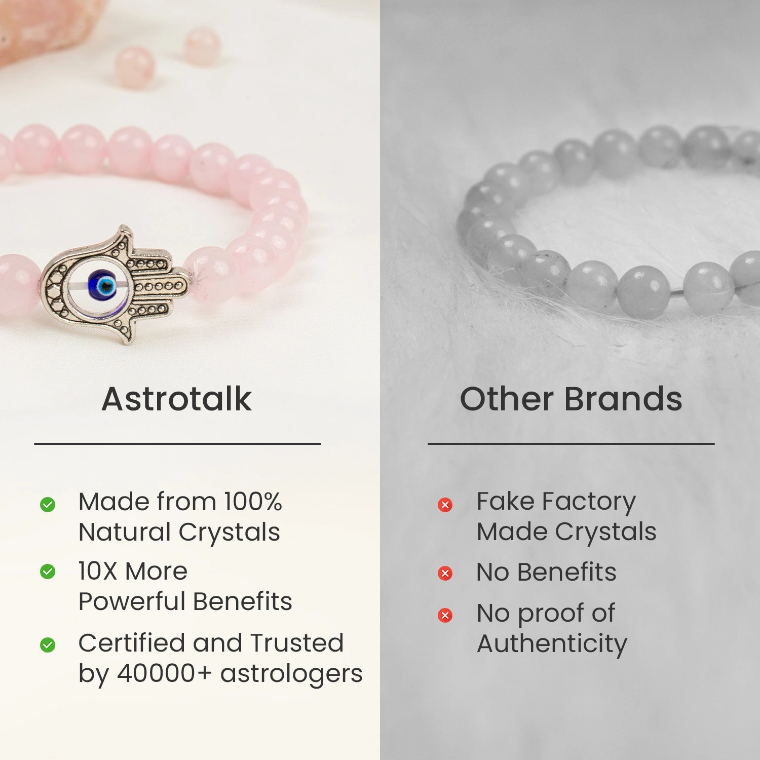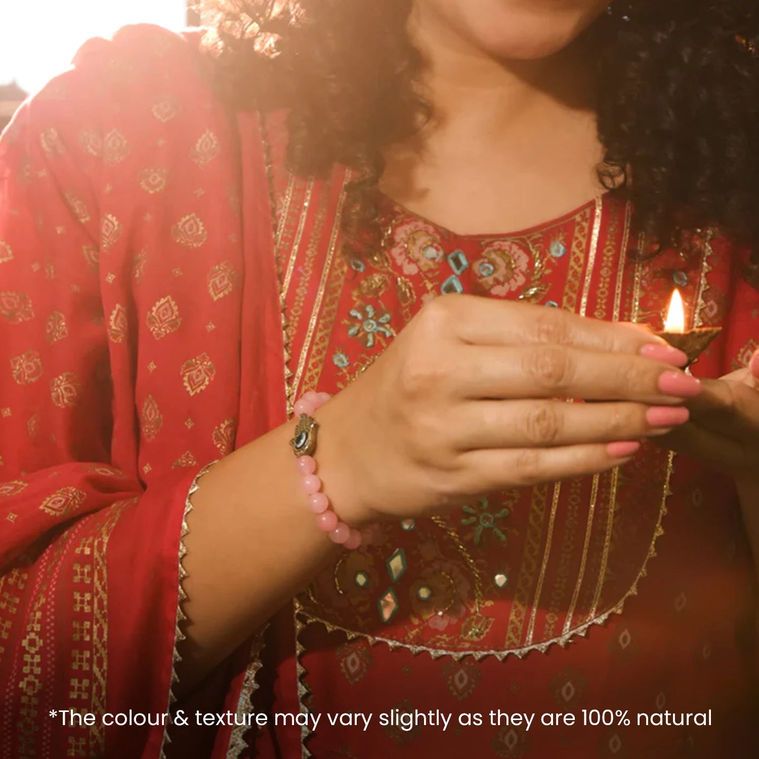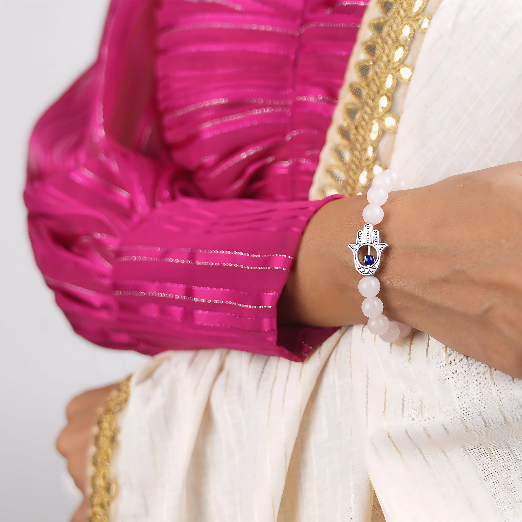 Love Attraction with Evil Eye Hamsa BraceletThe Love Attraction with Evil Eye Hamsa Bracelet is designed to attract love and positivity into your life. Made with soothing pink rose quartz crystals, it helps open your heart to love, strengthen relationships, and boost self-love. The evil eye hamsa charm protects you from negativity and bring peace and balance. This beautiful bracelet reminds you to love yourself and stay open to meaningful connections every day. Perfect for anyone seeking love, harmony, and emotional healing.