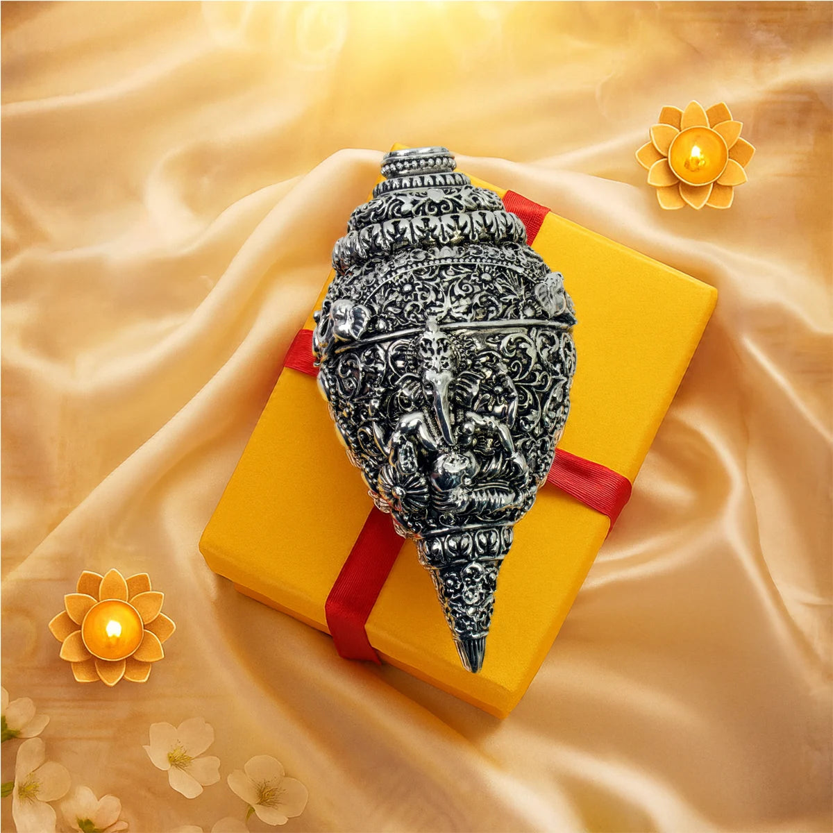 Siddh Silver Plated Ganesh Shankh (Conch)Invite divine blessings, prosperity, and peace into your home with this Siddh Silver Plated Ganesh Ji Shankh, specially blessed during the sacred Maa Lakshmi Pooja. The shankh is revered in tradition for removing negativity and spreading positivity, while Lord Ganesha is worshipped as the remover of obstacles and the giver of wisdom, success, and happiness. 🌸🙏