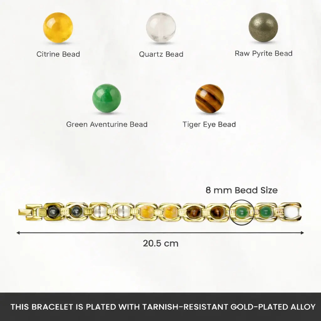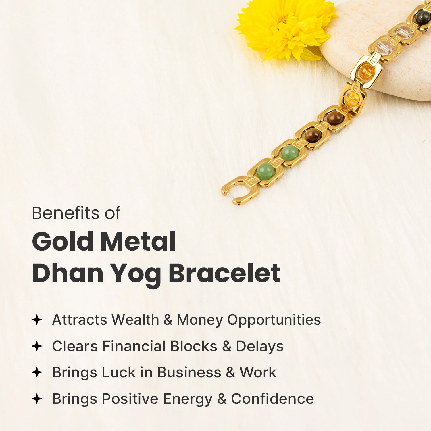 The Gold Metal Dhan Yog Bracelet is made to attract wealth, boost confidence, and support positive financial energy. Crafted with 100% genuine crystals and premium anti-tarnish gold-plated metal, it combines powerful energy benefits with an elegant, stylish look.