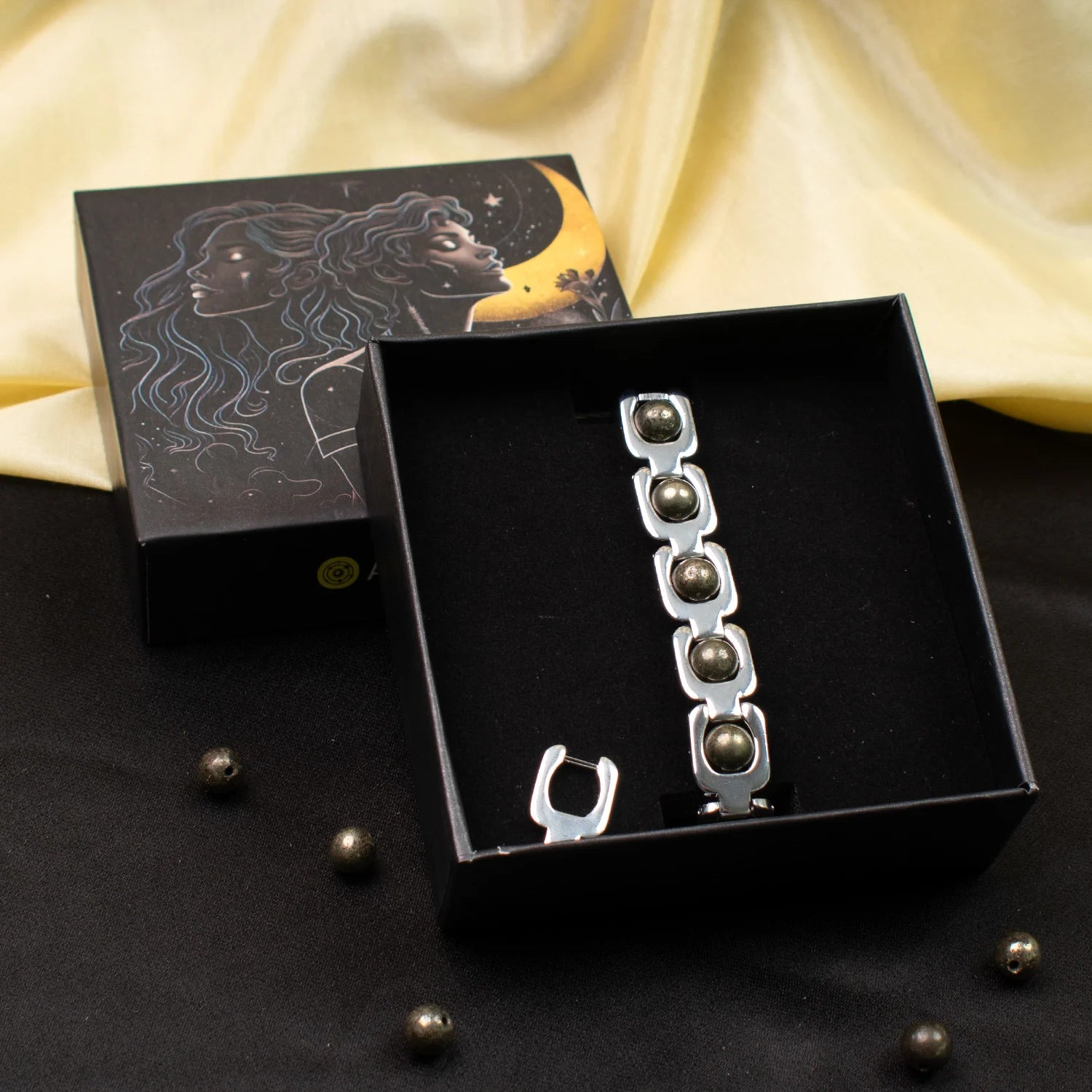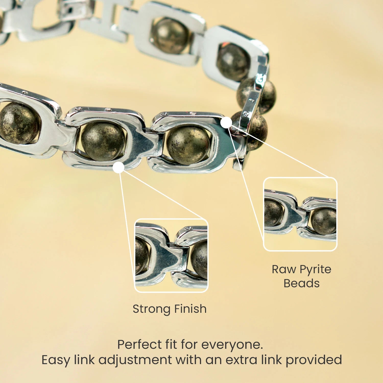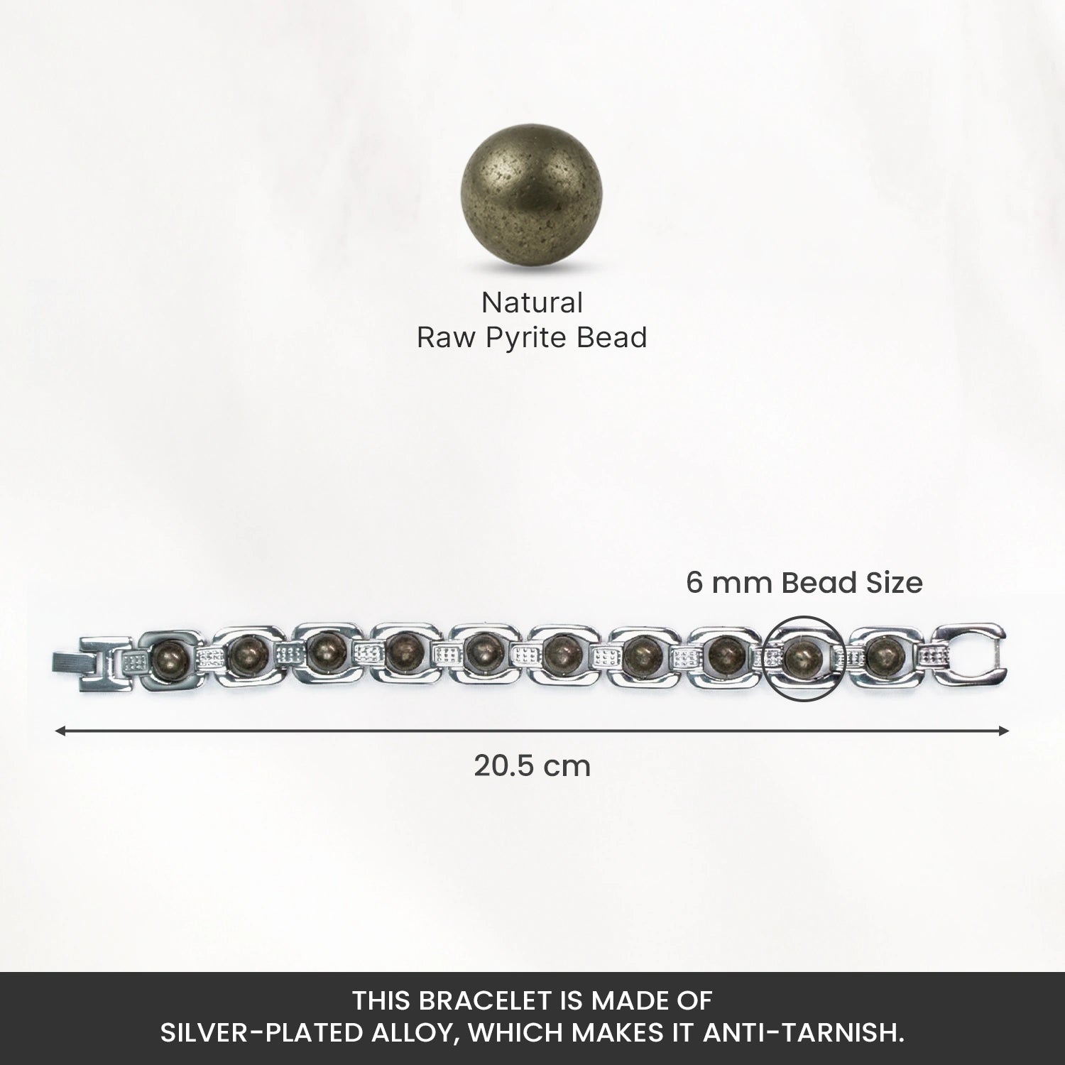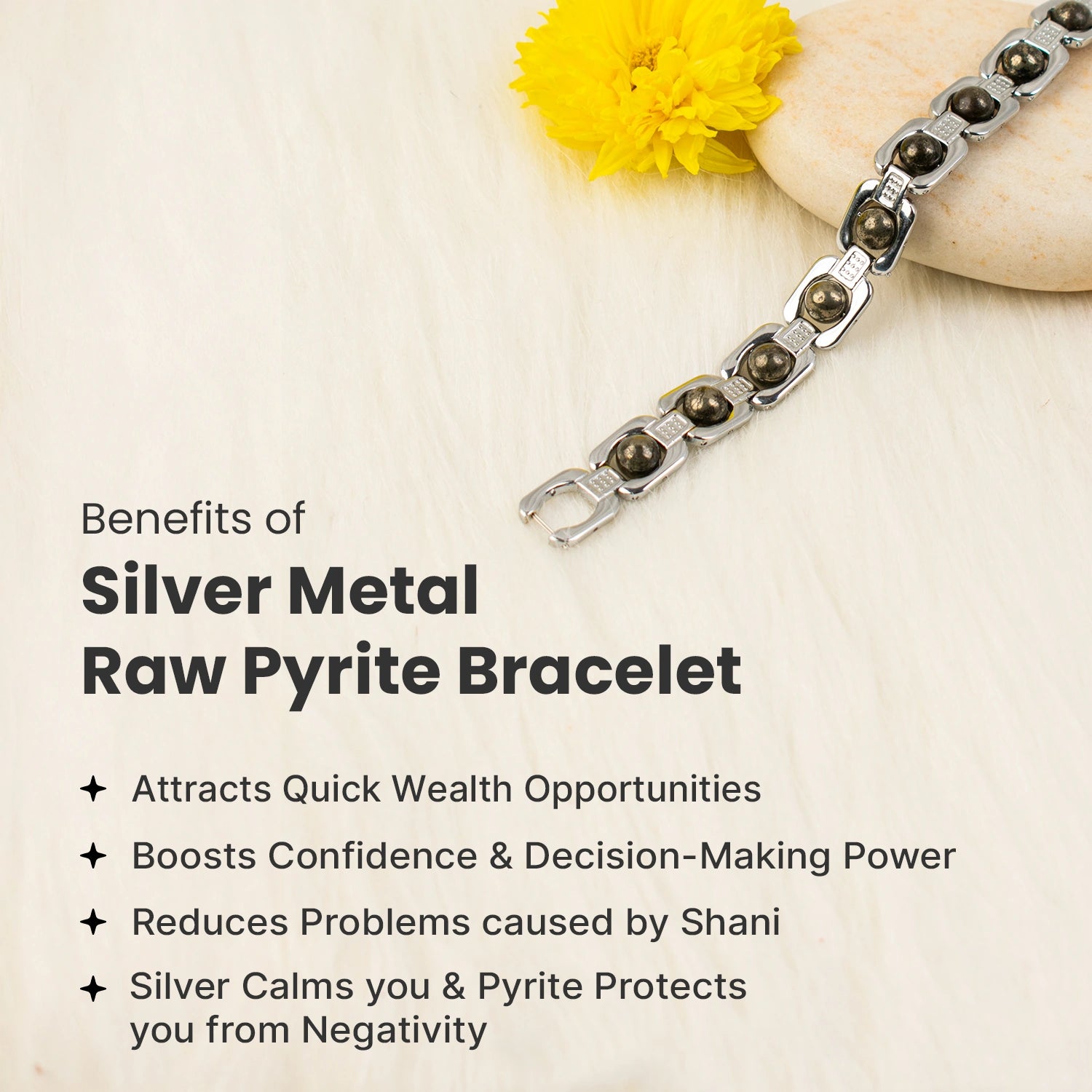 Silver Raw Pyrite BraceletPyrite is a powerful money magnet that draws wealth, success, and abundance. Its bold energy boosts willpower and confidence. When combined with silver, its energies of prosperity get amplified while providing an elegant look.