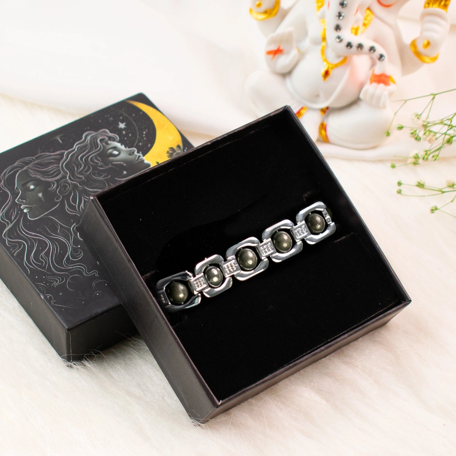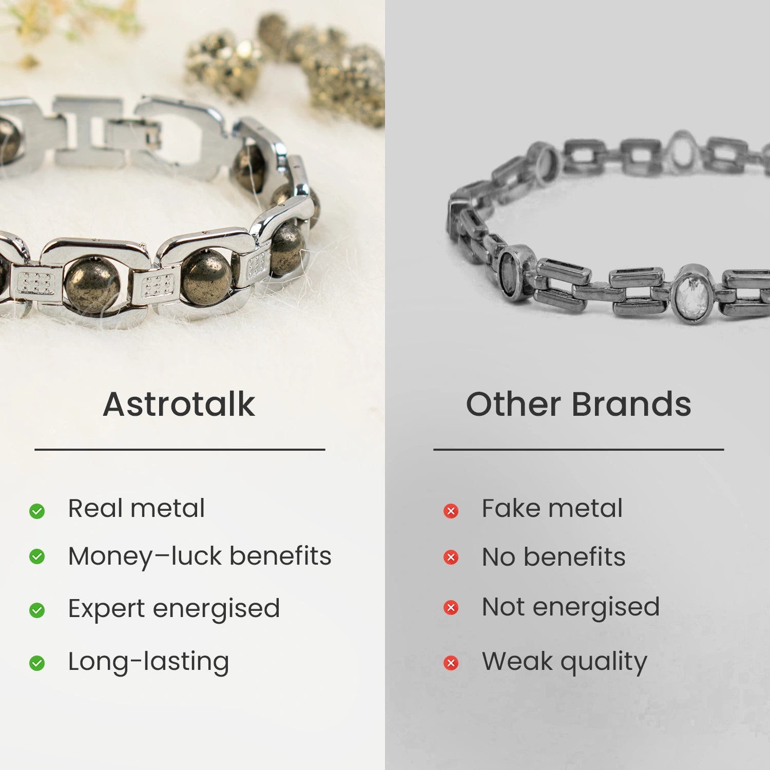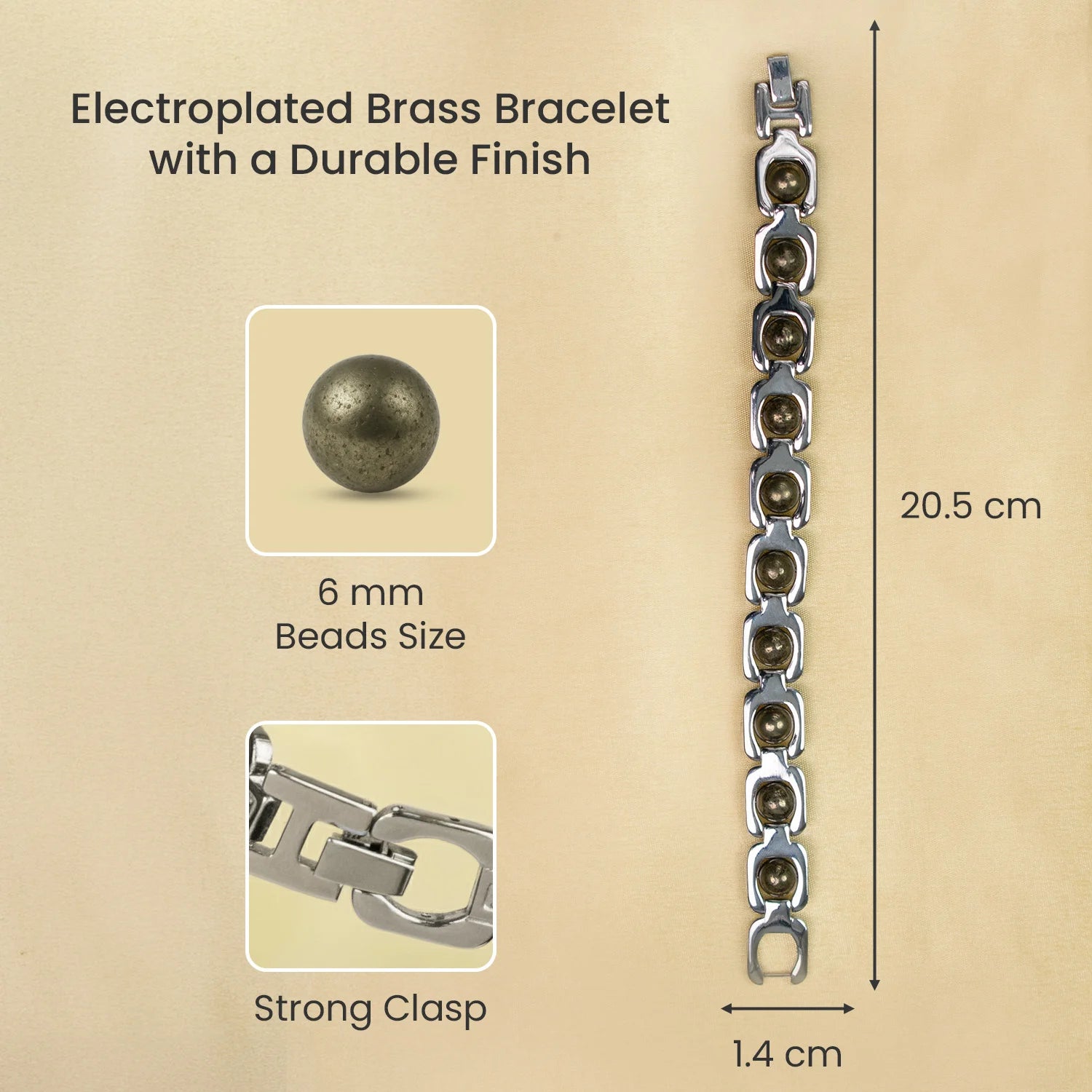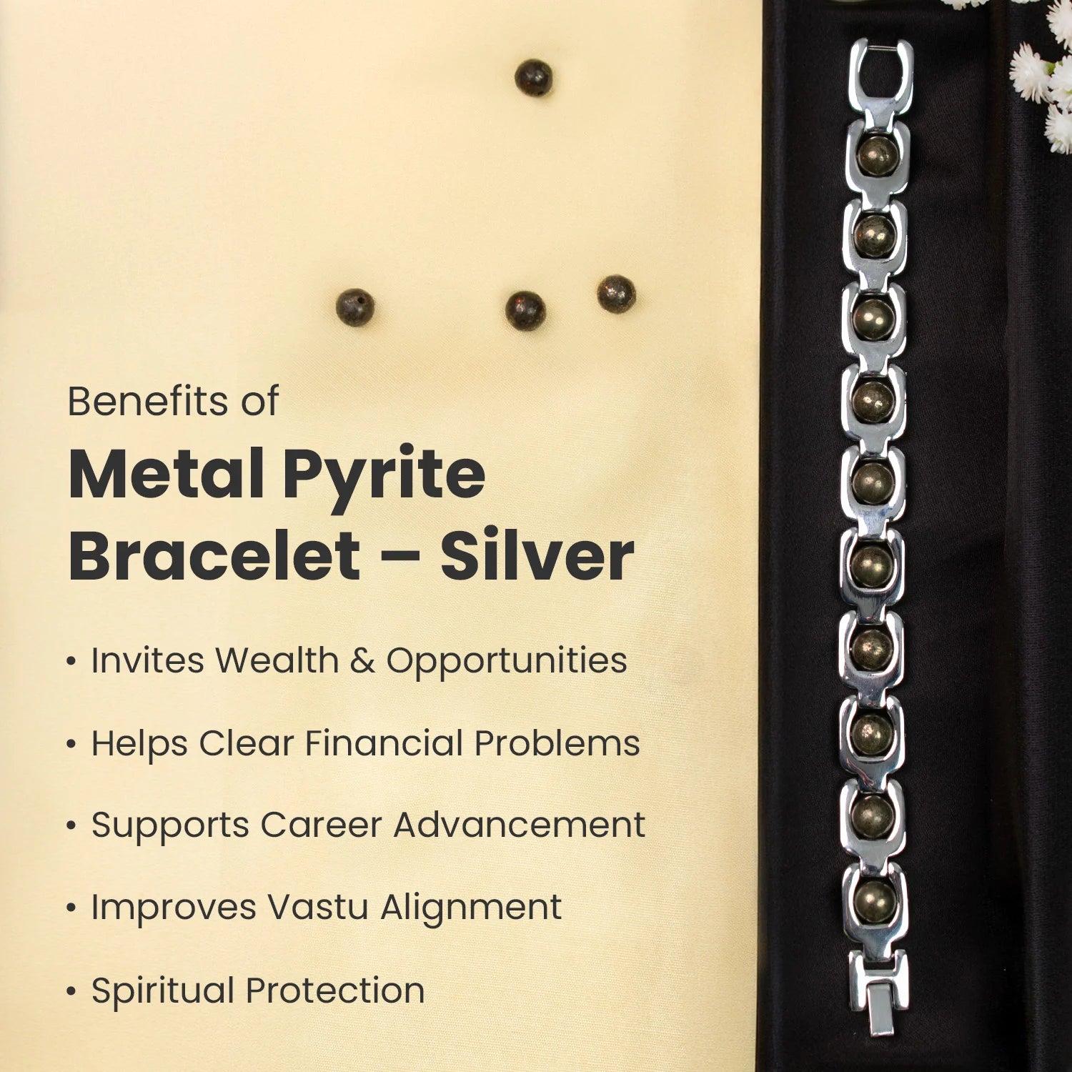 Silver Raw Pyrite BraceletPyrite is a powerful money magnet that draws wealth, success, and abundance. Its bold energy boosts willpower and confidence. When combined with silver, its energies of prosperity get amplified while providing an elegant look.