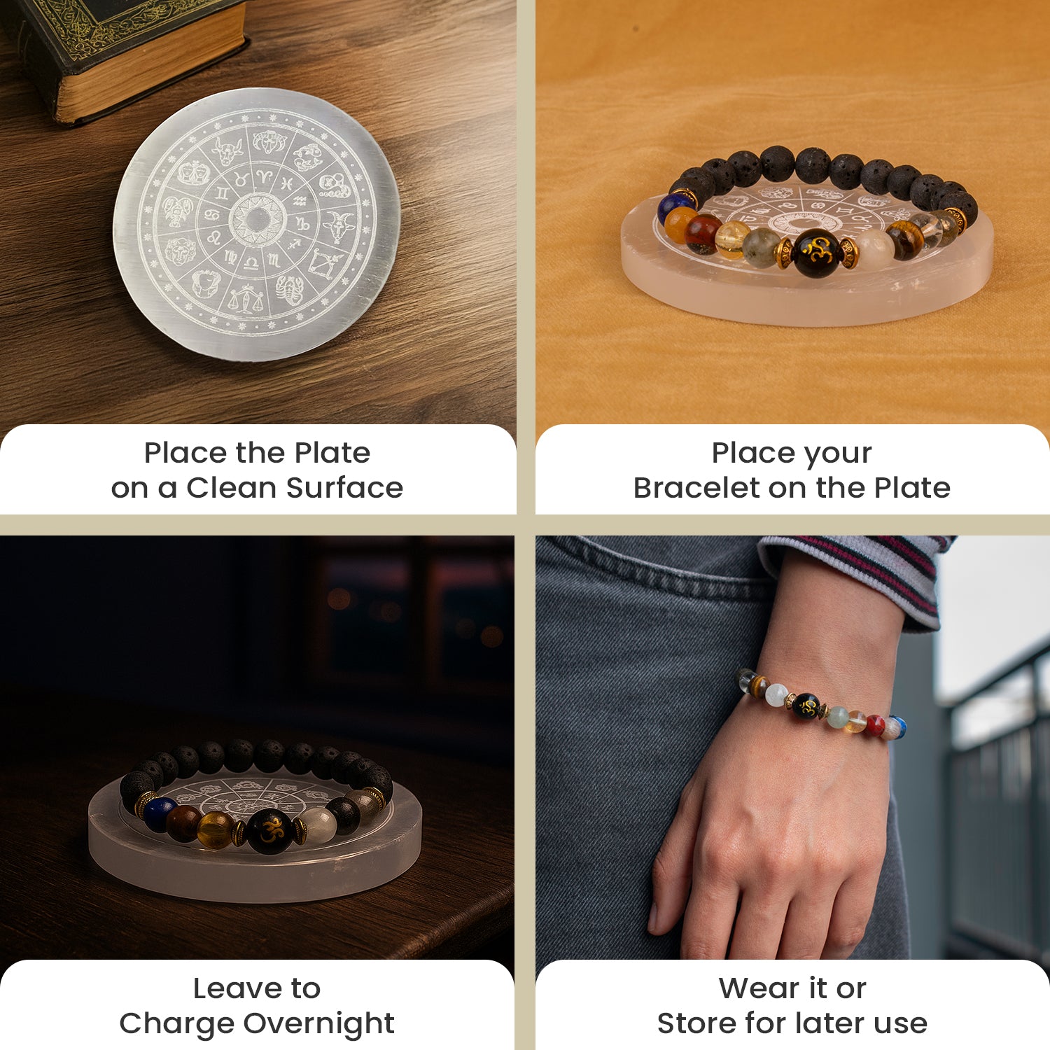 Place the bracelet on the Raw Selenite Plate every Monday or on a Full Moon day to cleanse and recharge its energy for best results.