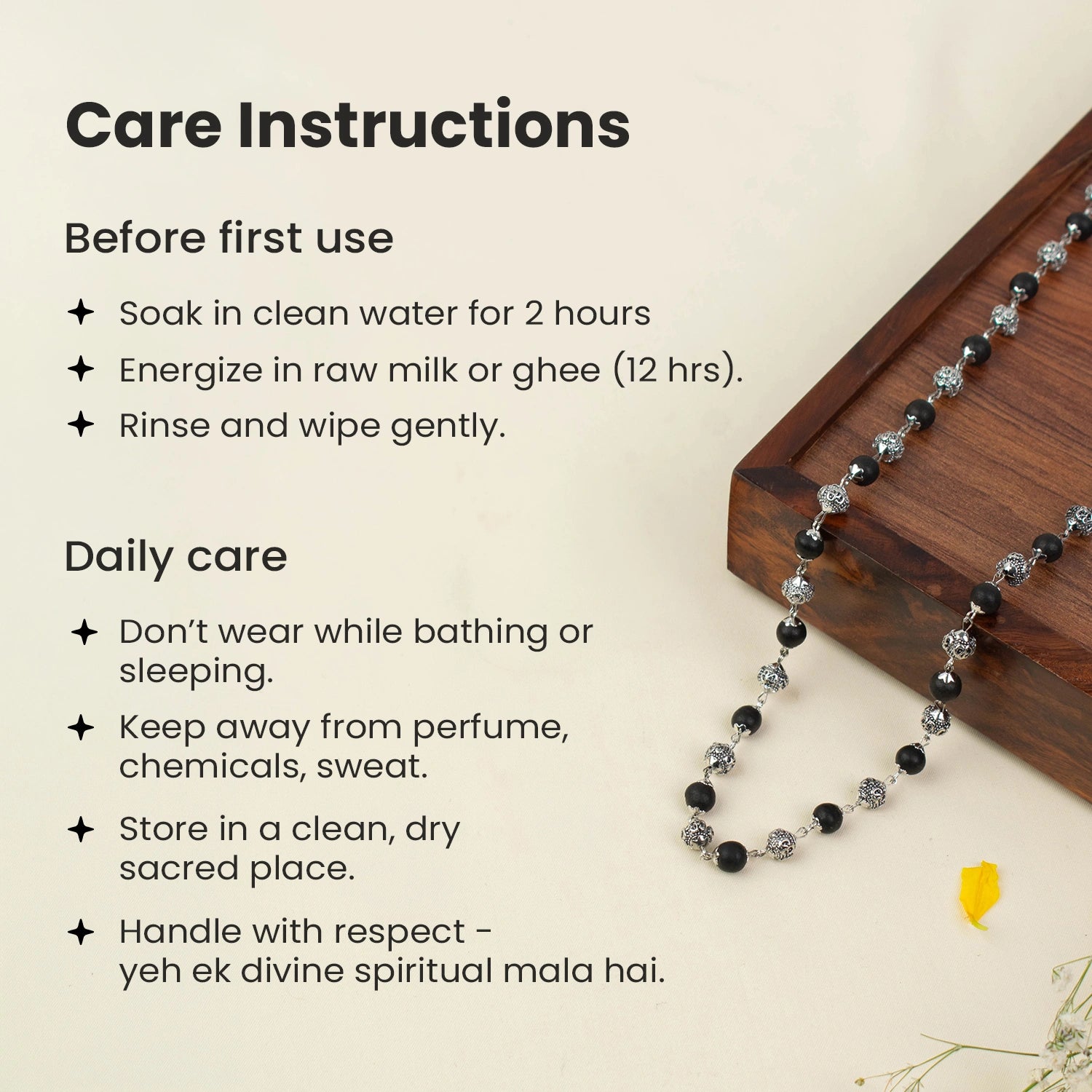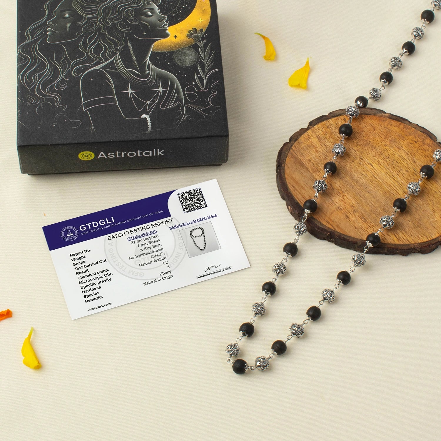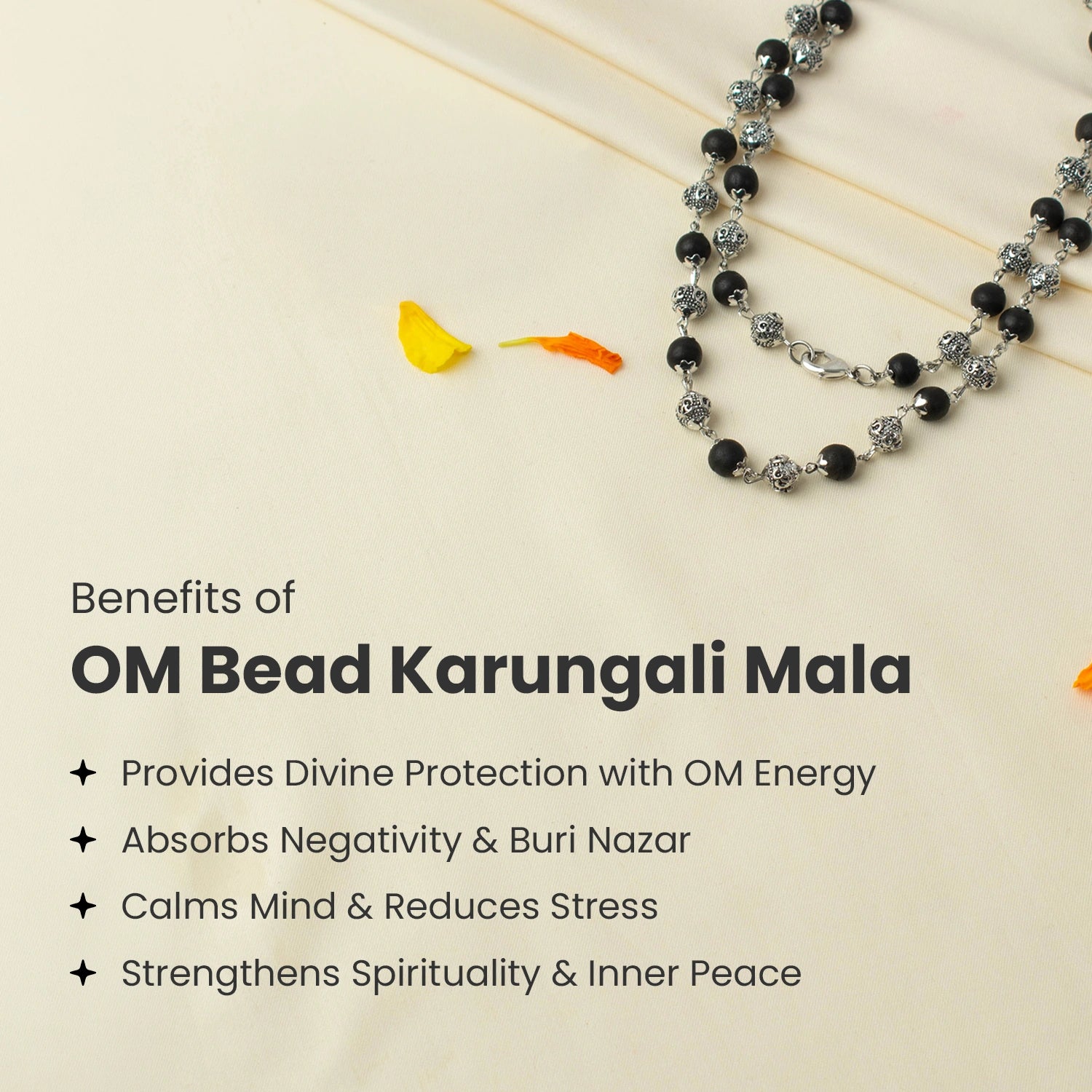 Crafted with authentic Karungali beads, known for negativity protection, and paired with silver-plated OM beads symbolising peace and spiritual balance, this mala supports emotional stability and aura cleansing.
