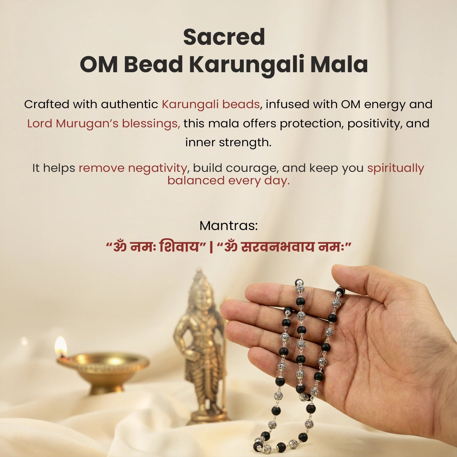 Prepaid orders are delivered on priority.Experience protection and inner calm with the OM Bead Karungali Mala, a sacred blend of grounding wood energy, divine Om vibrations, and the blessings of Lord Murugan.