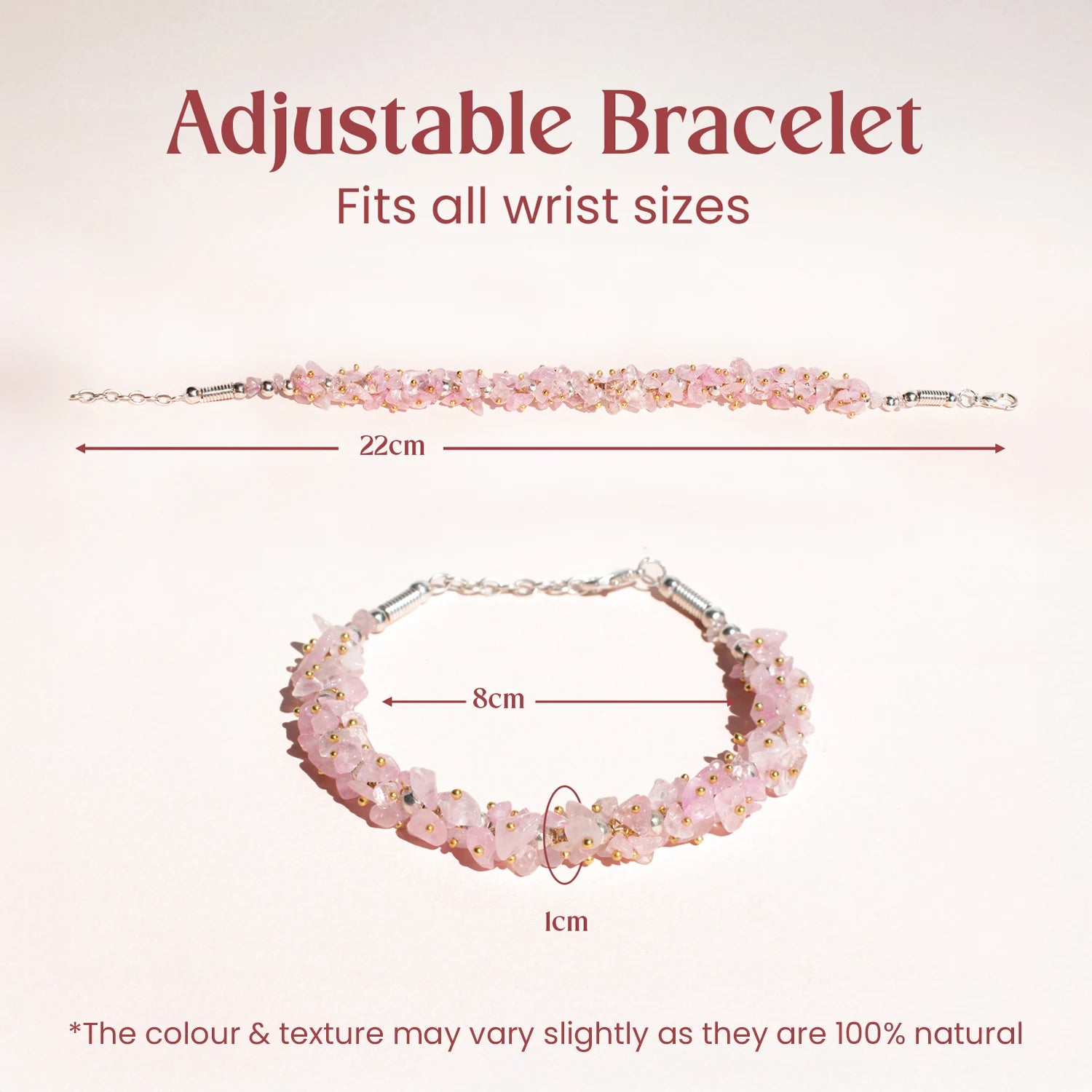 - Rose Quartz Chips Bracelet: The “Stone of Love” that attracts affection, heals emotional pain, and promotes harmony and self-love.