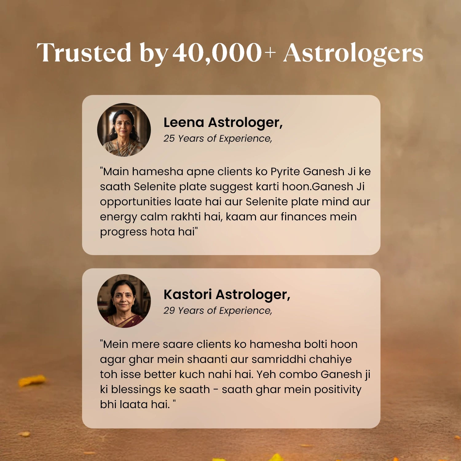 Lord Ganesha, the remover of obstacles and giver of wisdom, is carved in natural Pyrite—a powerful crystal known to attract wealth, success, and shield against negative energies. The included Raw Selenite Plate from Morocco cleanses and recharges your idol, keeping it energetically vibrant and ready to bless your space.