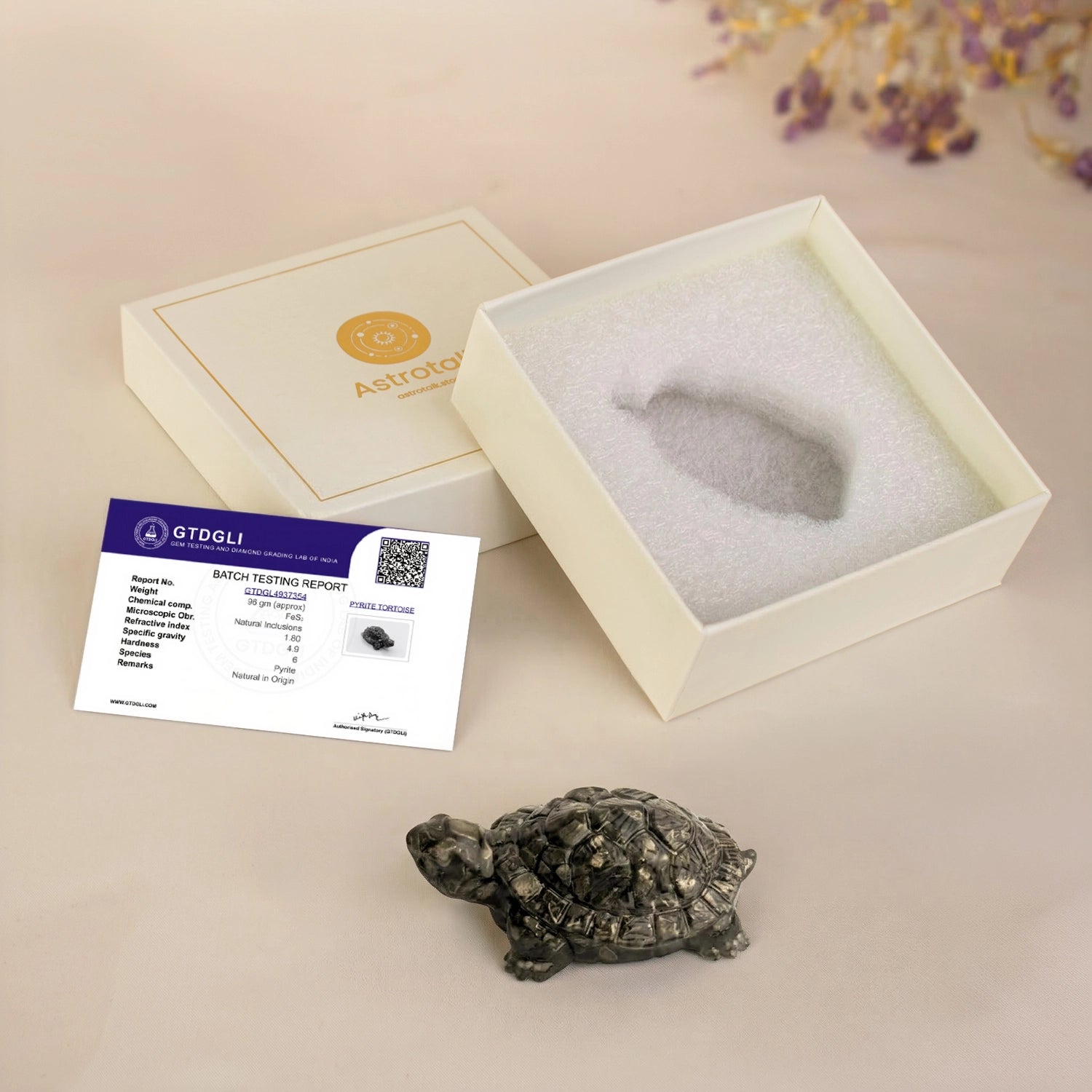In Vastu Shastra, the tortoise is a symbol of Lord Kurma, representing strength and long-lasting stability. This Pyrite Tortoise combines the "Stone of Wealth" with the protective nature of the tortoise to bring balance to your space.