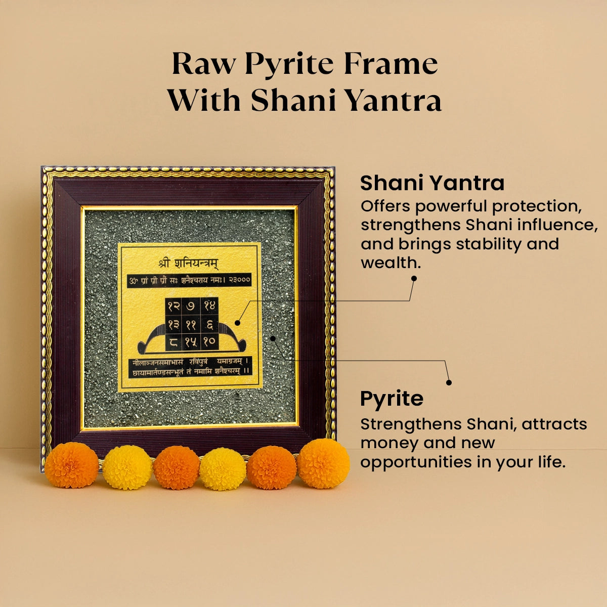 Prepaid orders are delivered on priority.Invite divine blessings with this powerful Pyrite basesd Shani Dev Yantra on complimentary frame featuring an energised pyrite stone and sacred Shani Yantra. The natural pyrite stone attracts wealth, prosperity, and success, while the Shani Yantra helps remove obstacles and instils discipline, focus, and justice. Perfect for homes and offices, this frame channels positive energy from Shani Dev, promoting perseverance, balance, and long-term growth in all areas of life.