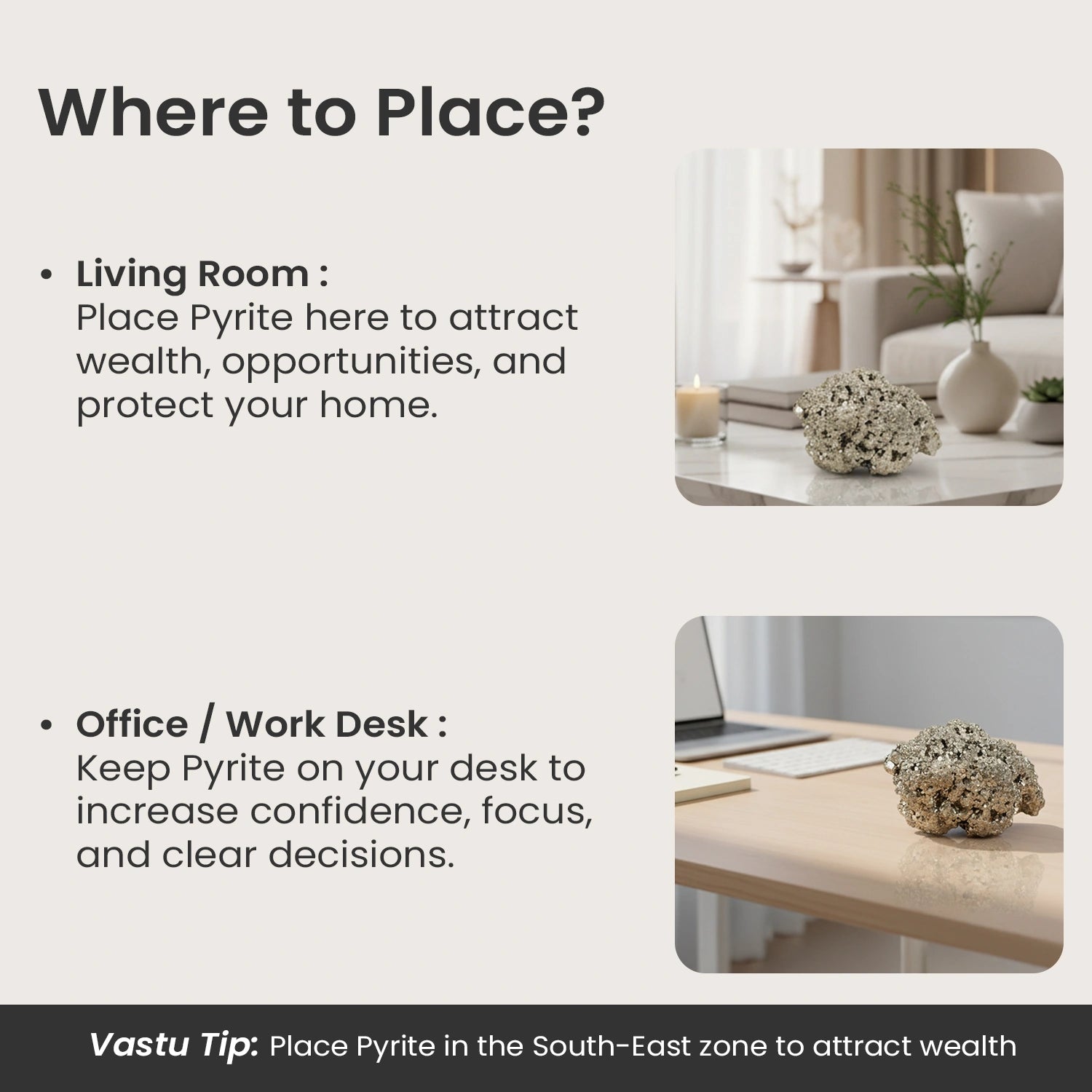 Perfect for your home, office, or shop, this Pyrite stone boosts confidence, focus, and motivation, helping you welcome more prosperity and good fortune into your life.
