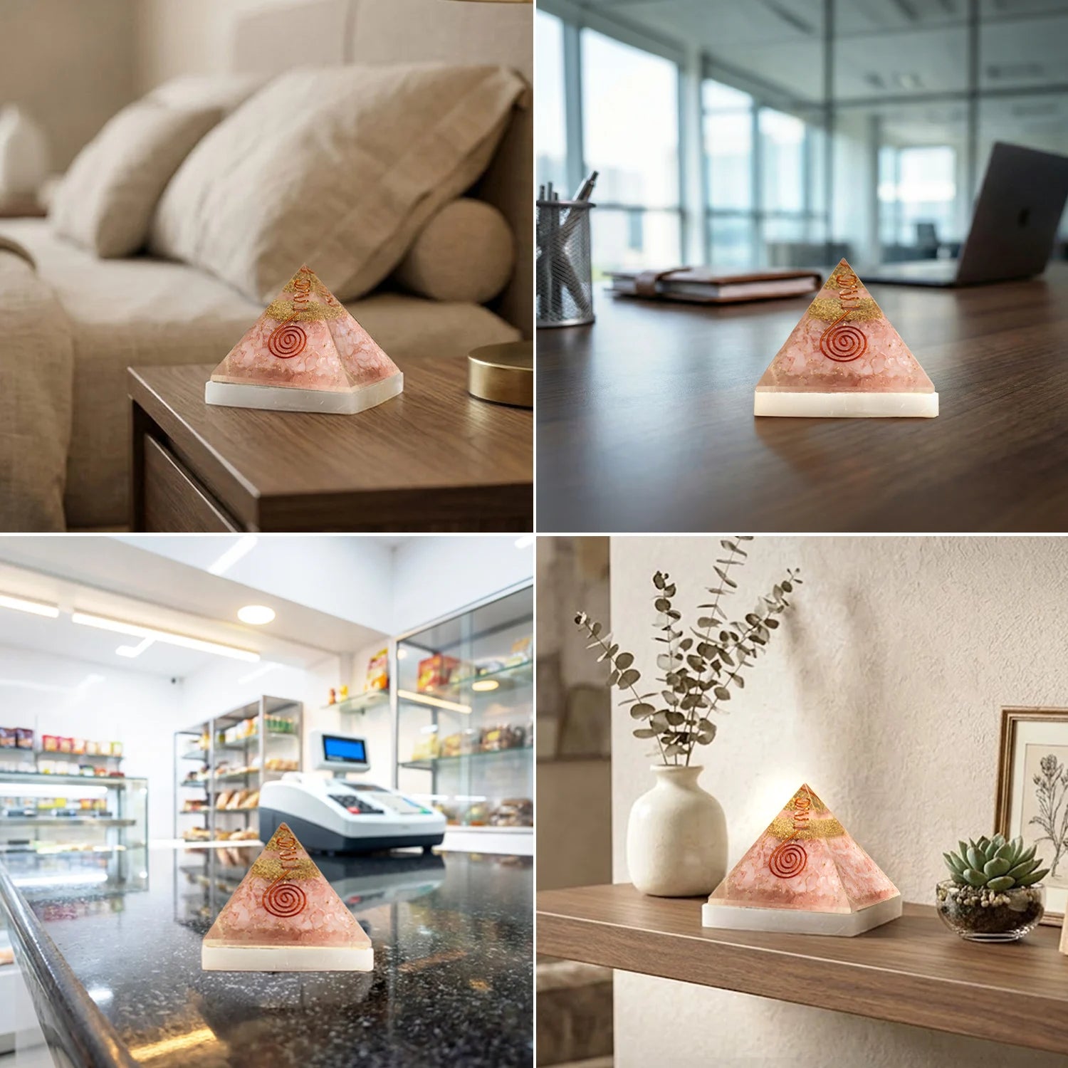- Rose Quartz Pyramid – The Rose Quartz Pyramid promotes love, emotional balance, and inner peace while reducing stress and negativity.