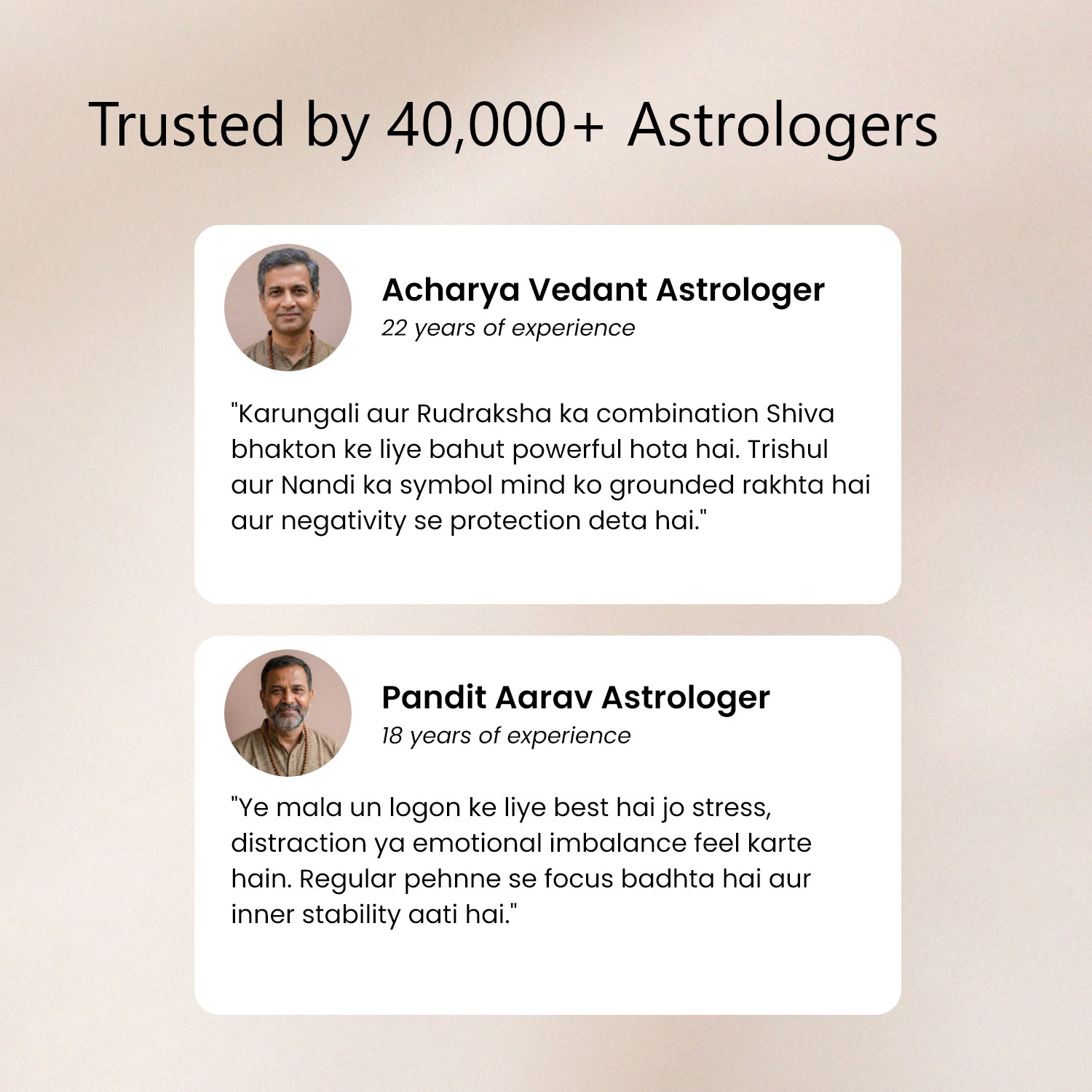 Prepaid orders are delivered on priority.This sacred Shiv Raksha Karungali Rudraksha Mala with Trishul Nandi Pendant is designed to bring protection, faith, and inner stability into daily life. It is made using a powerful combination of authentic Karungali (Black Ebony) beads and 5 Mukhi Rudraksha beads, both known for grounding energy, mental calmness, and spiritual balance.